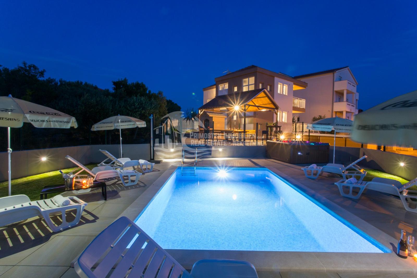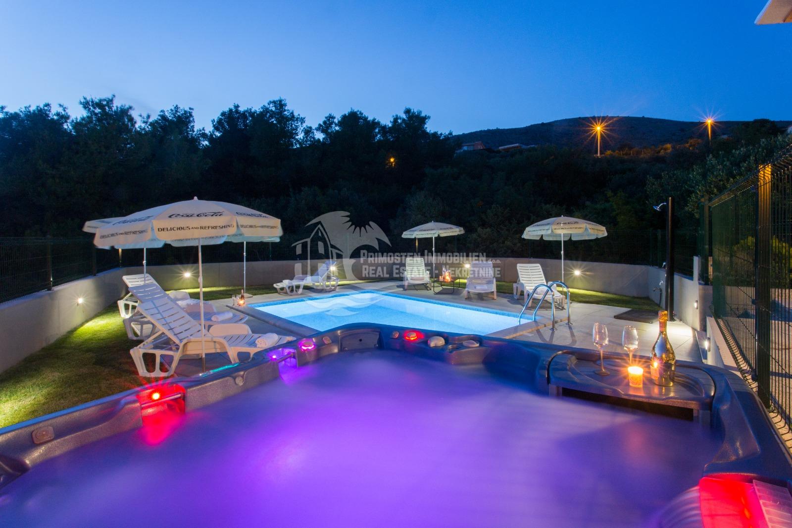 Ispred kuće nalazi se bazen s jacuzzijem i sunčalištem, te natkriveni roštilj s velikim stolom za ugodna druženja na otvorenom. Okućnica je uređena i oplemenjena zelenilom i ukrasnim biljem, a na raspolaganju je nekoliko parking mjesta....