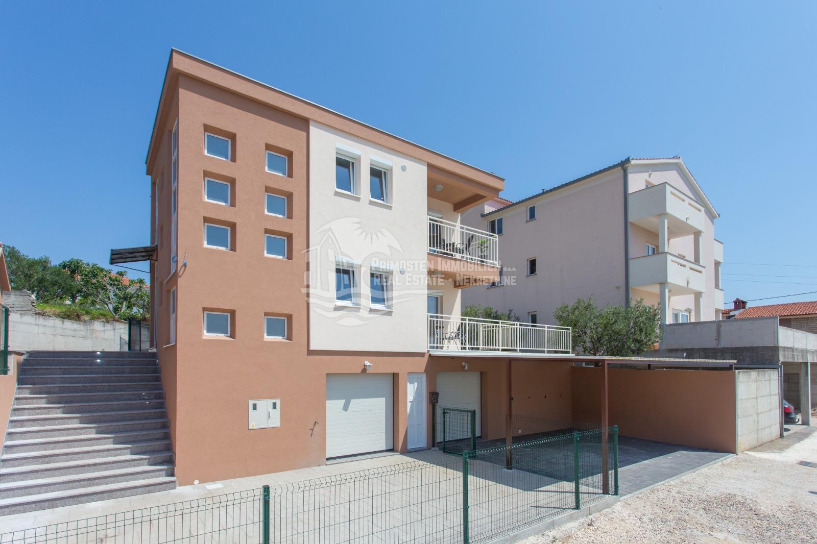 Prva etaža: Apartman površine cca 85 m², kompletno namješten i uređen. Sastoji se od dvije spavaće sobe, kupaonice, hodnika, kuhinje s blagovaonicom, prostranog dnevnog boravka i velike terase s panoramskim pogledom na more.
