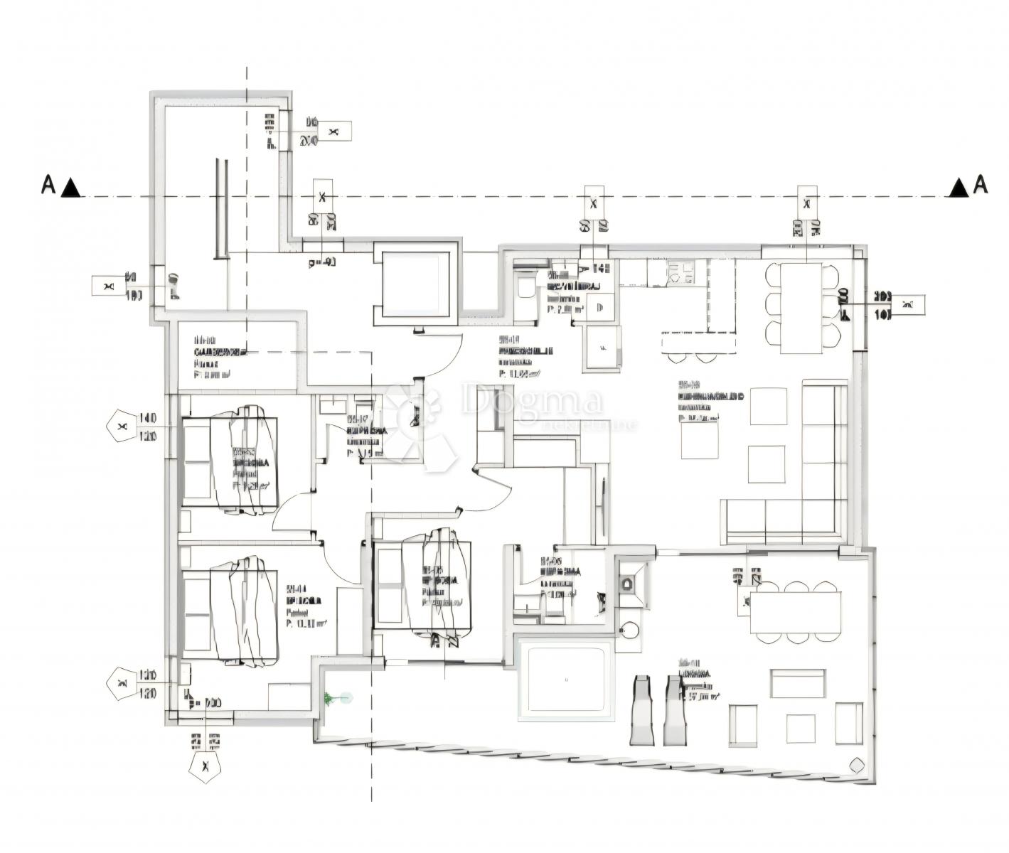 Stan se sastoji od tri spavaće sobe, od kojih dvije imaju vlastitu kupaonicu i garderobu, dok se u ostatku stana nalaze još jedan zaseban WC, hodnik te prostrani dnevni boravak povezan s kuhinjom i blagovaonicom u jedinstvenu cjelinu. Iz dnevnog dijela izlazi se na natkrivenu lođu s koje se pruža otvoreni pogled na more.