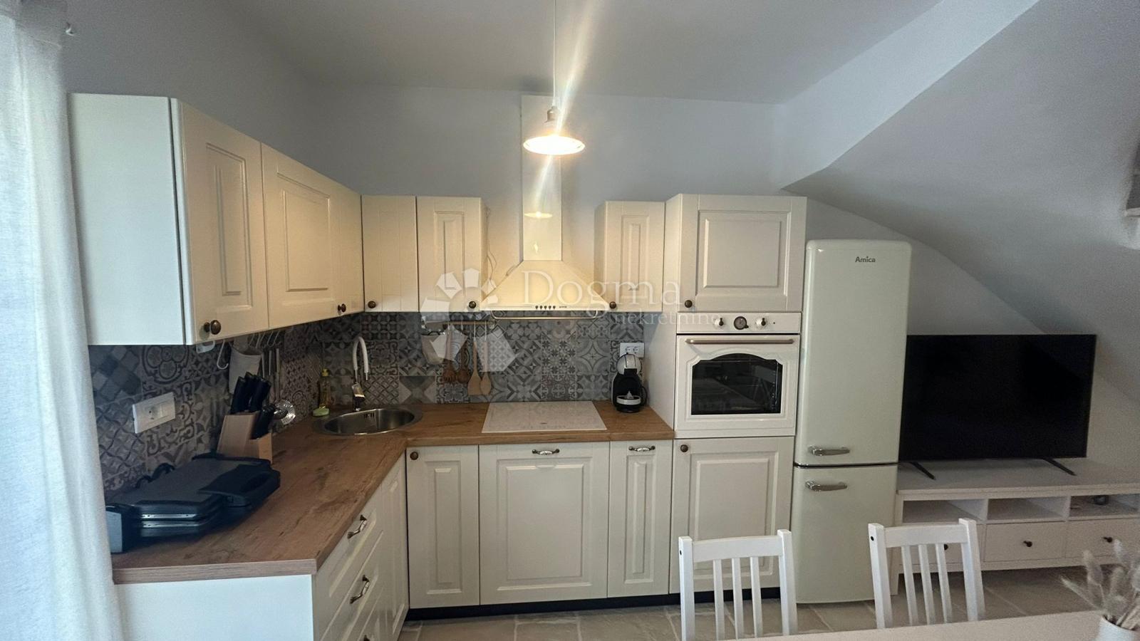 U prizemlju se nalaze prostrani dnevni boravak, blagovaonica i kuhinja, sve povezano u ugodan otvoreni prostor ispunjen prirodnim svjetlom. Prizemlje dodatno uključuje kotlovnicu/vešeraj i elegantno uređenu kupaonicu, što dodatno doprinosi funkcionalnosti i udobnosti prostora. Na prvom katu nalaze se dvije udobne spavaće sobe, svaka sa svojom vlastitom kupaonicom, što osigurava privatnost za sve članove obitelji ili goste. Sve prostorije opremljene su klimatizacijskim uređajima za optimalnu udobnost tijekom cijele godine.