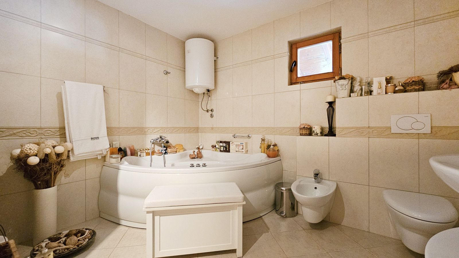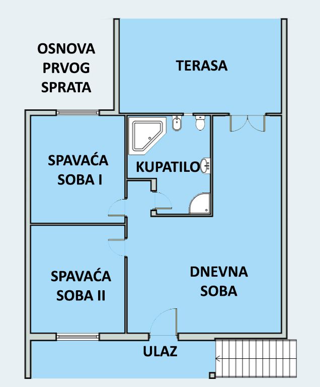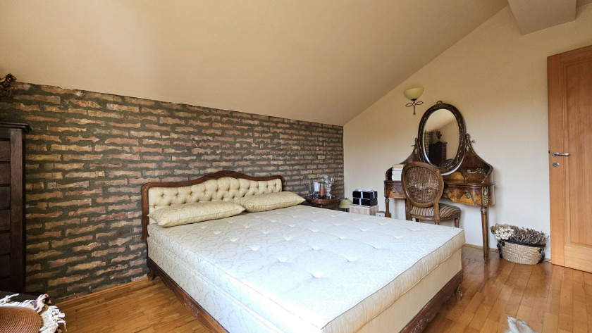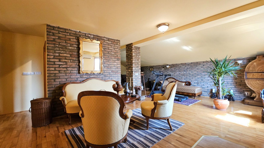 Gornji nivo: dnevni boravak od 35 m² sa izlazom na prelepu terasu, dve spavaće sobe i elegantno kupatilo sa đakuzijem i tuš kabinom.