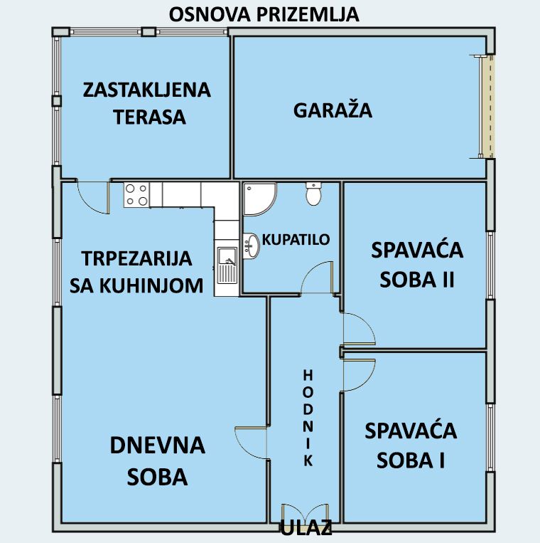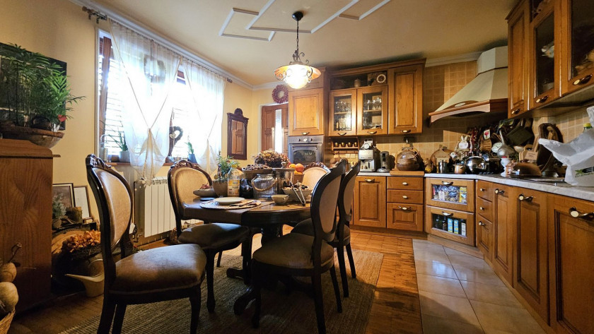 Donji nivo: prostrani ulazni hodnik, veliki dnevni boravak sa trpezarijom i kuhinjom (open space koncept), spavaća soba, garderober, moderno kupatilo i zimska bašta.