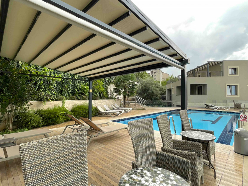 Tri stana dijele privatni prostor od 200m2 s bazenom, ležaljkama, tušem i pogledom na Bokokotorski zaljev, sa stolom i stolicama za svaki stan. Prostor je uređen drvećem i grmljem. Cijeli proctor(200m2) s bazenom uključen je u cijenu apartmana.