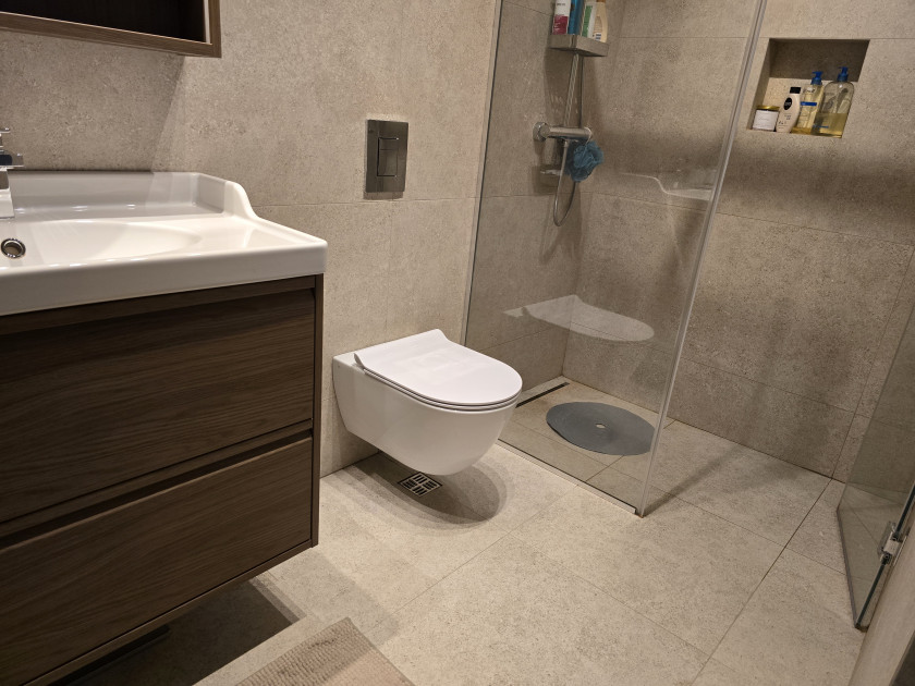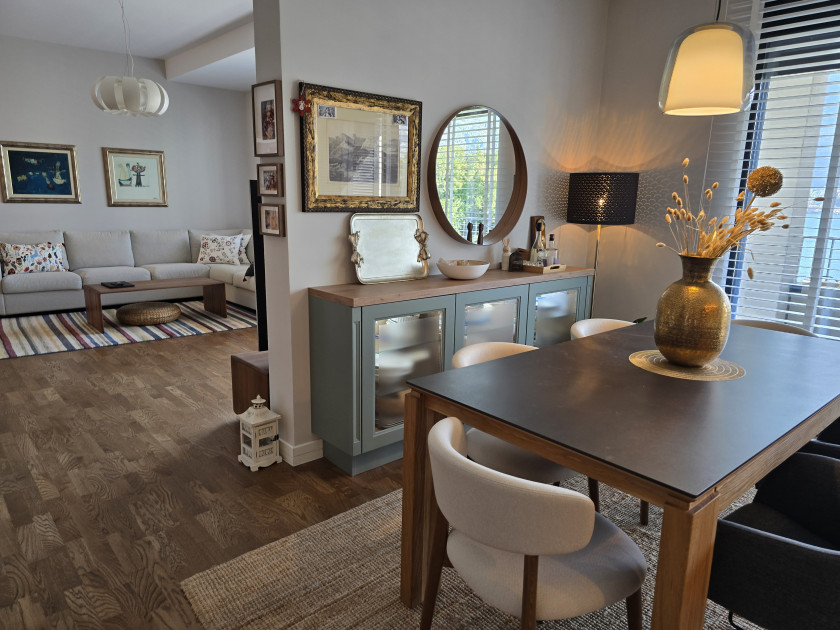 Stan ima 3 sobe, 2 kupatila, WC, vešeraj, špajz, dnevnu sobu sa trpezarijom i kuhinjom, hodnik, kao i velike balkone na oba nivoa sa 4 vanjske ostave, vanjskom mini kuhinjom i 4 tende sa motorima.