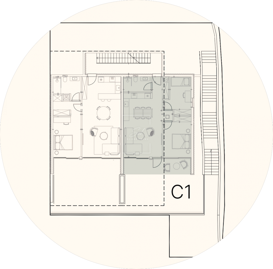 Iz dnevnog boravka izlazi se na terasu (9 m² s uračunatim koeficijentom) te u uređeni vrt površine 57 m². Stanu pripadaju i dva parkirna mjesta u garaži, što dodatno doprinosi komforu i sigurnosti.