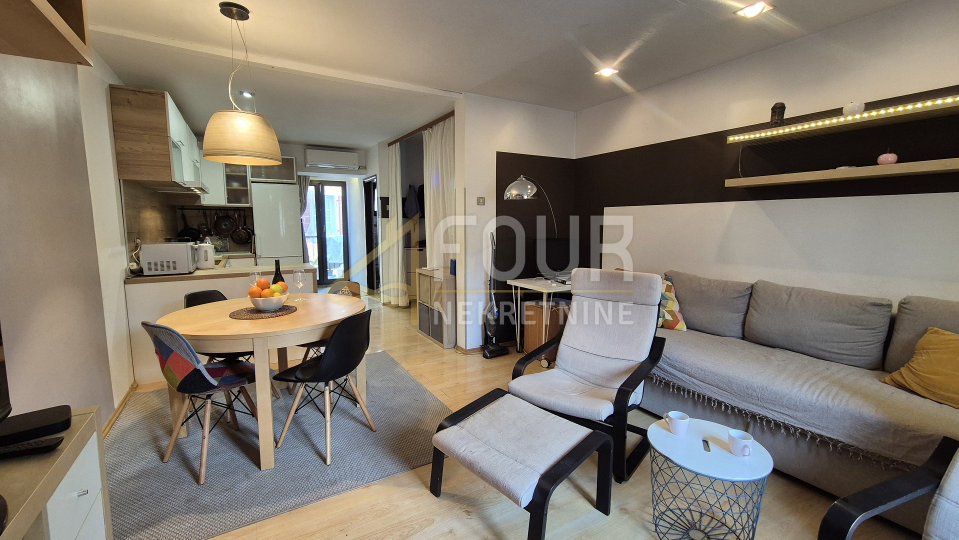 Dvoetažni stan brutto površine 66.11m2/ netto površine 51.34m2, donja etaža stana sastoji se od opremljene kuhinje s dnevnim boravkom i izlazom na balkon te kupaonice, dok se na gornjoj etaži nalaze dvije spavaće sobe s krovnim prozorima.