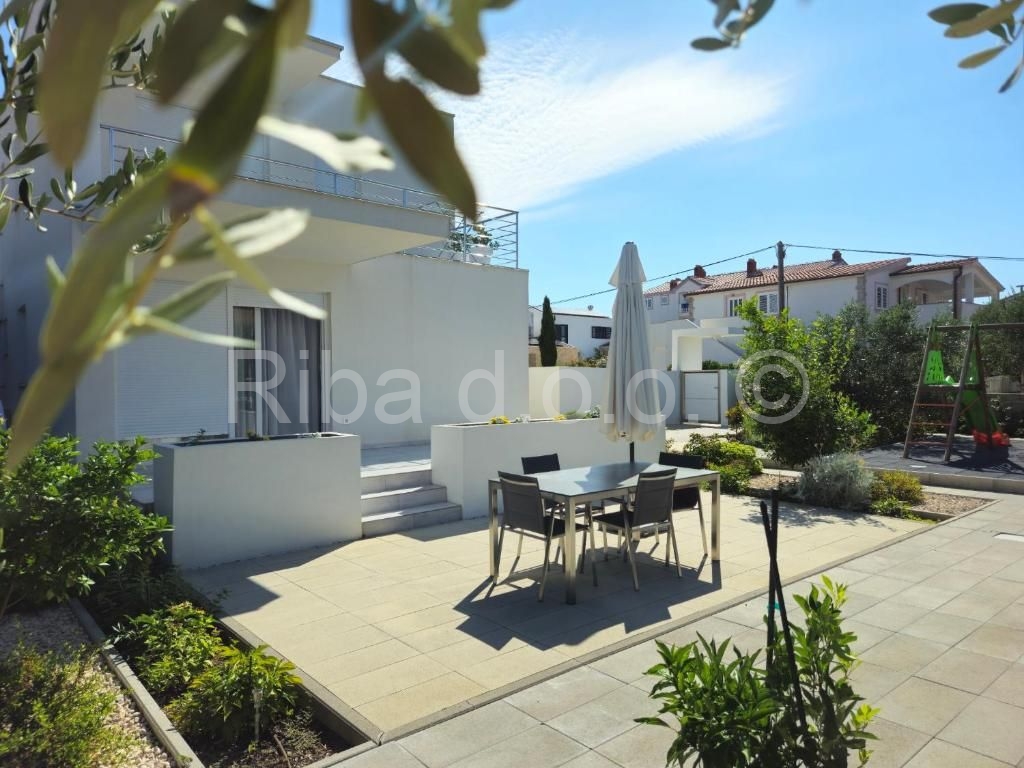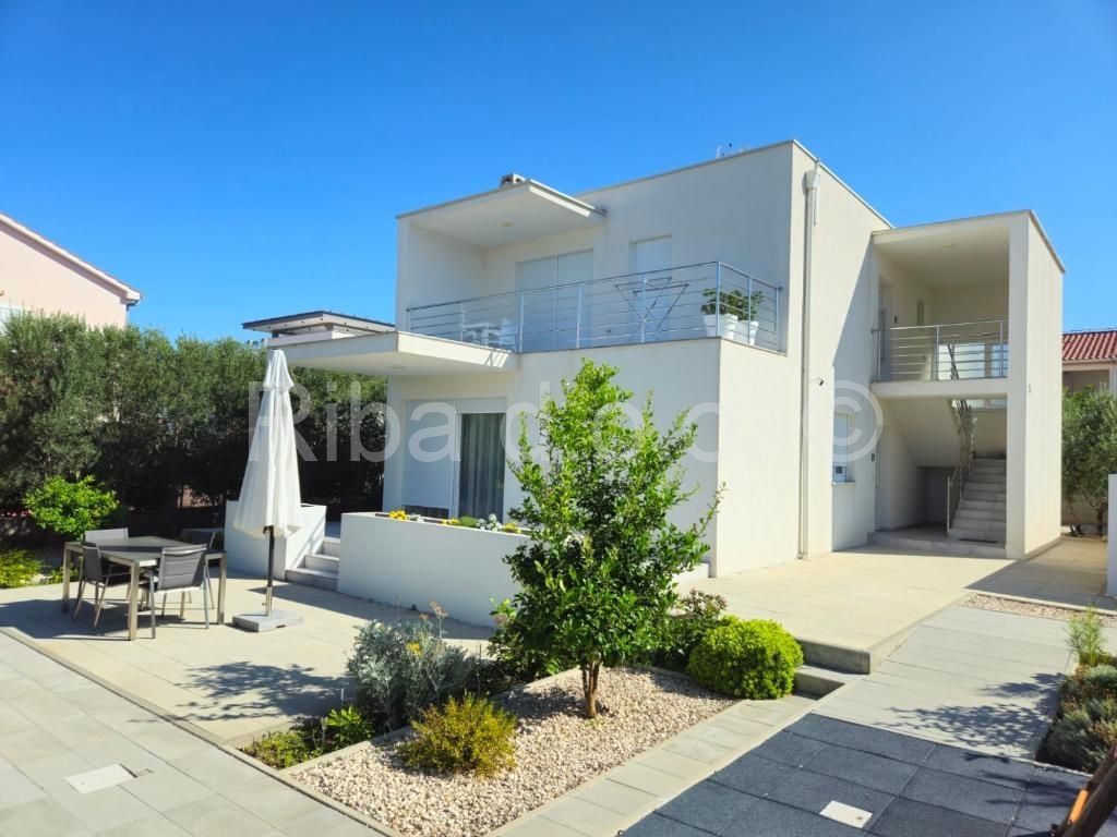 Prodaje se moderno izgrađena i luksuzno opremljena samostojeća kuća katnica u mirnom mjestu Vrsi, u blizini Zadra. Ova nekretnina je idealna investicija za turistički najam ili za kombinaciju vlastitog odmora i iznajmljivanja, s obzirom da je već uhodana u turistički smještaj s visokim ocjenama.