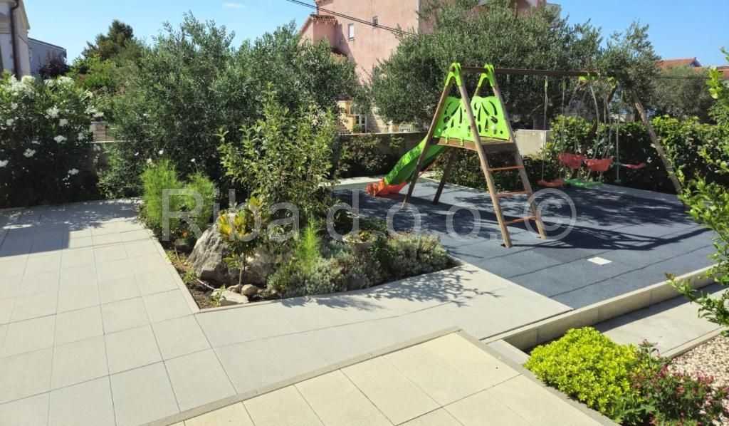 U prizemlju je prostrani obiteljski apartman koji se sastoji od 3 spavaće sobe, svaka soba sa svojom kupaonom, a najveća soba ima i garderobu. Tu je još i prostrani dnevni boravak s kuhinjom i blagovaonicom, hodnik, 1 zasebni toalet, praonica, smočnica i prostrana terasa iz koje se izlazi u prekrasno uređen vrt.