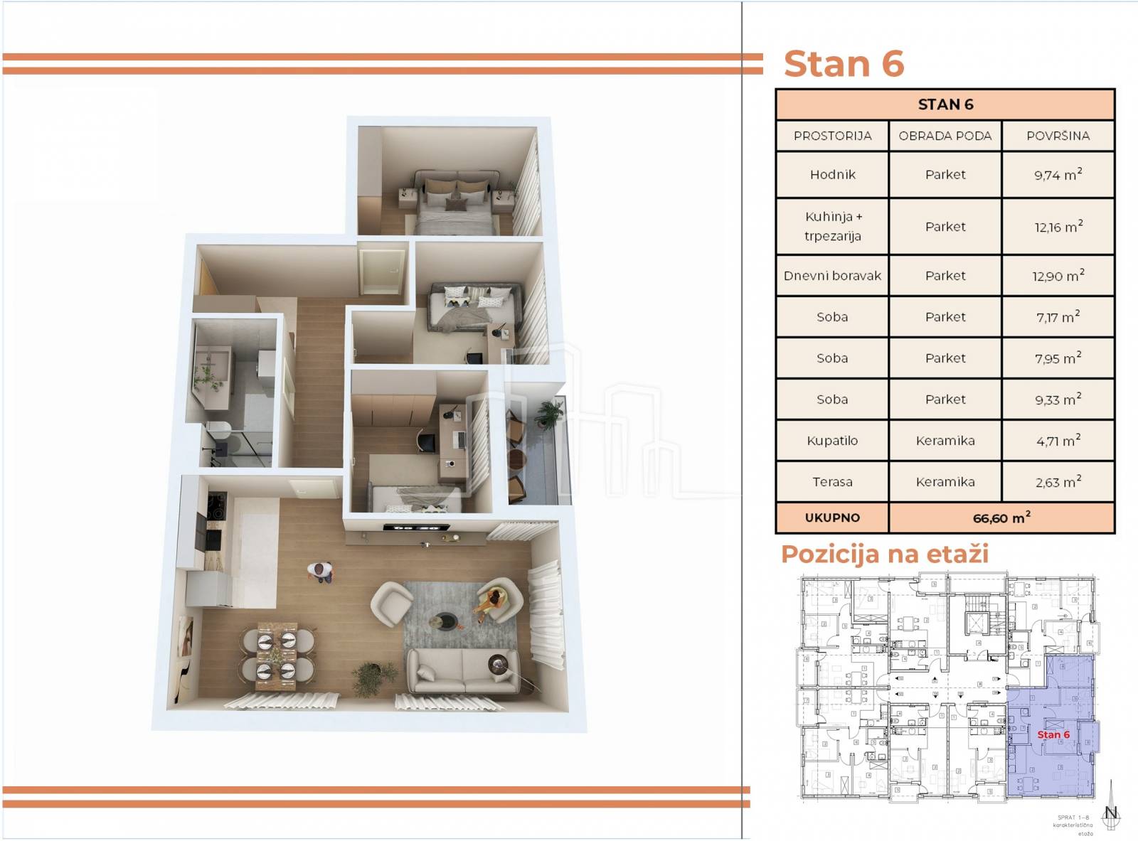 Predmetni stanovi površine 66,6m2 su dostupni od prvog do sedmog sprata.