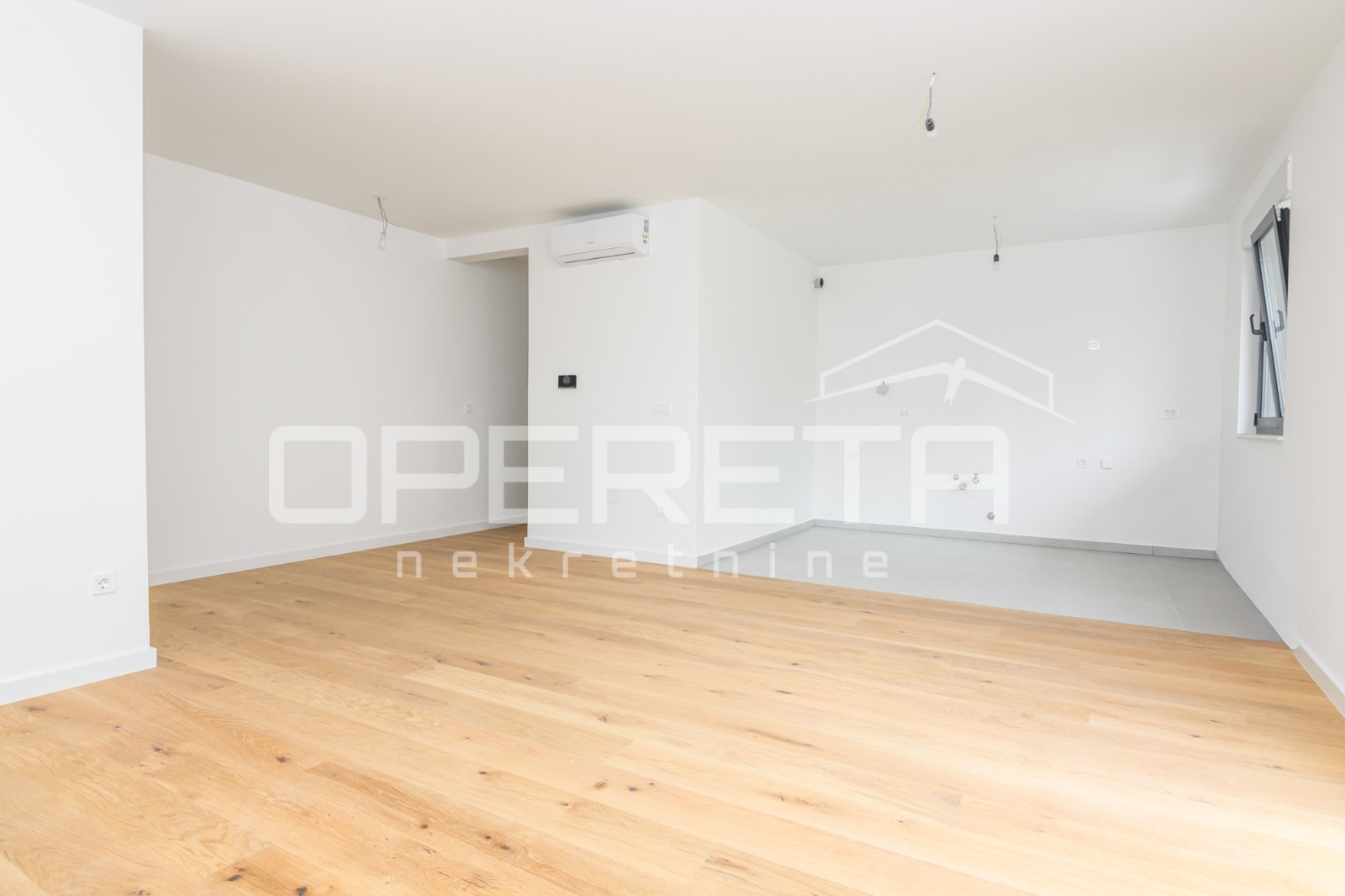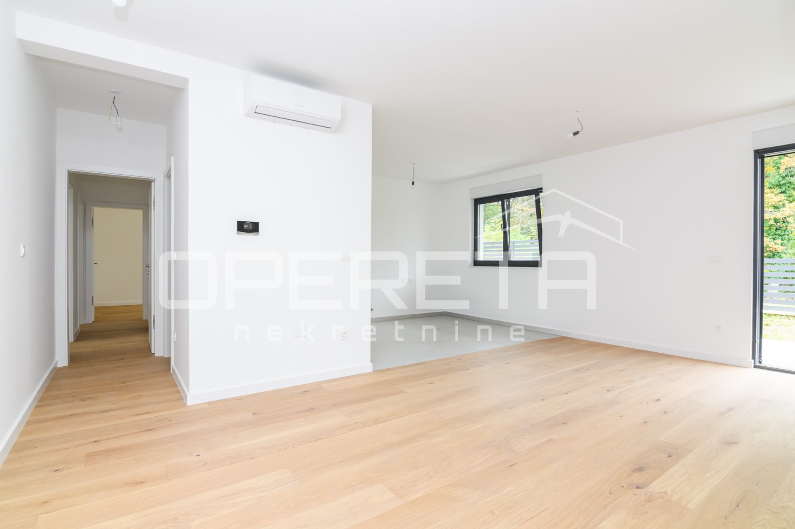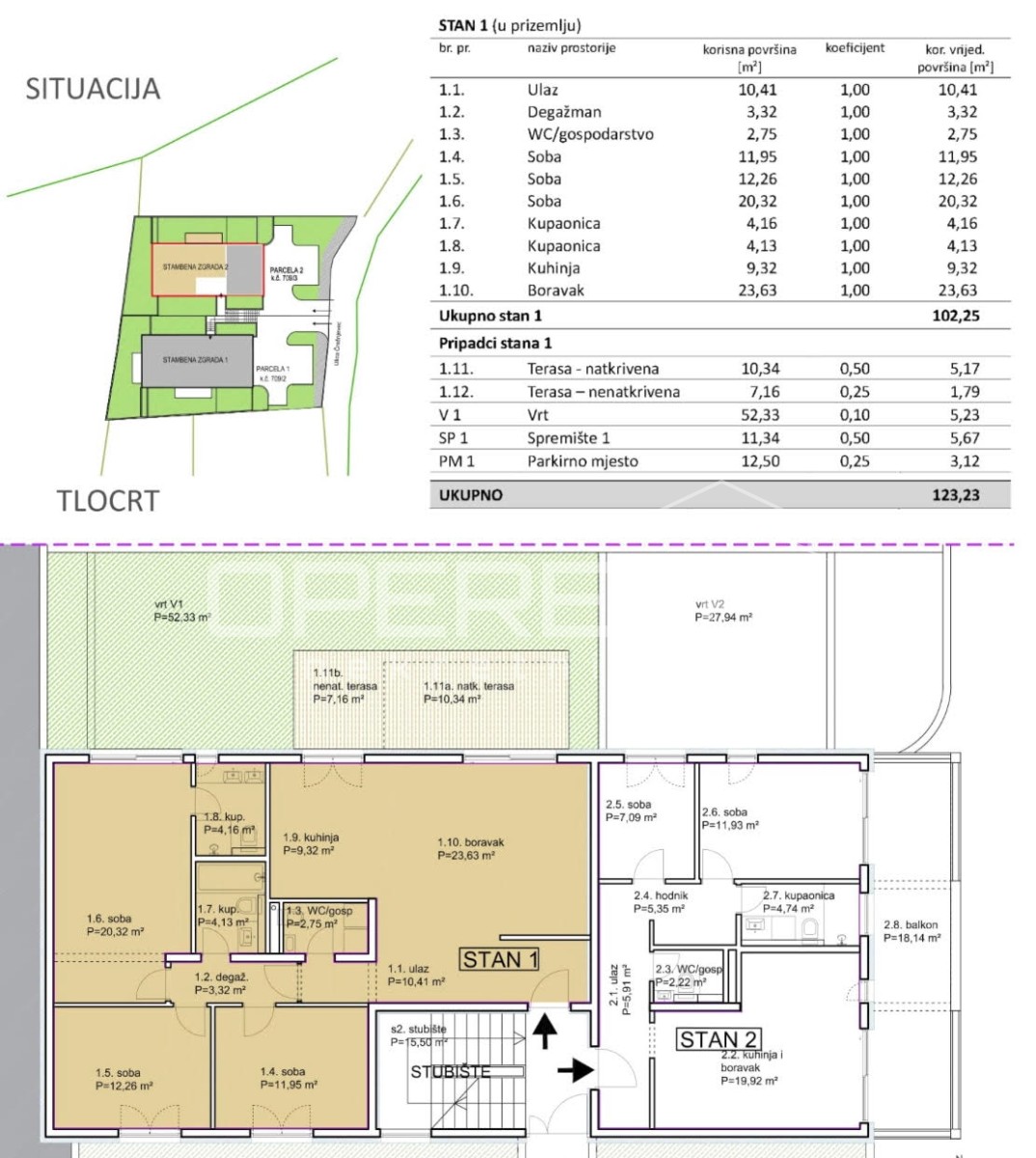 Opis: Prodaja, Stan, Remete, Novogradnja, 4s, 137m2, Vrt.Stan 1 - četverosoban stan u prizemlju zatvorene površine 102,25 m2, polunatkrivena terasa 17,50 m2, vrt 52,33 m2. Stan se sastoji od ulaznog prostora, dnevnog boravka, blagovaonice i kuhinje otvorenog tlocrta s izlazom na terasu i vrt, master sobe s kupaonicom, dodatne dvije spavaće sobe, kupaonice i gostinjskog wc-a/gospodarstva. Stanu pripada vanjsko parkirno mjesto 12,50 m2, garaža 20,28 m2 i spremište 7,88 m2. Ukupno obračunski NKP 137,44 m2.Alu stolarija, dizalice topline, prva klasa keramika/parket, električne rolete.Lokacija puna zelenila, privatnosti.