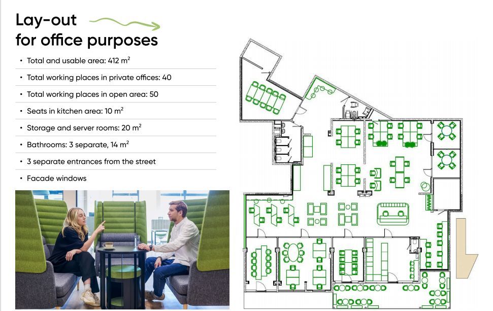 Poslovni prostor je projektovan i opremljen u skladu sa najvišim standardima savremenog poslovnog ambijenta. Enterijer je osmišljen od strane skandinavskih dizajnera, uz poseban fokus na funkcionalnost, estetiku i udobnost radnog prostora. U procesu projektovanja vođeno je računa o akustici, osvetljenju, ventilaciji i klimatizaciji, što omogućava prijatno i produktivno radno okruženje.
