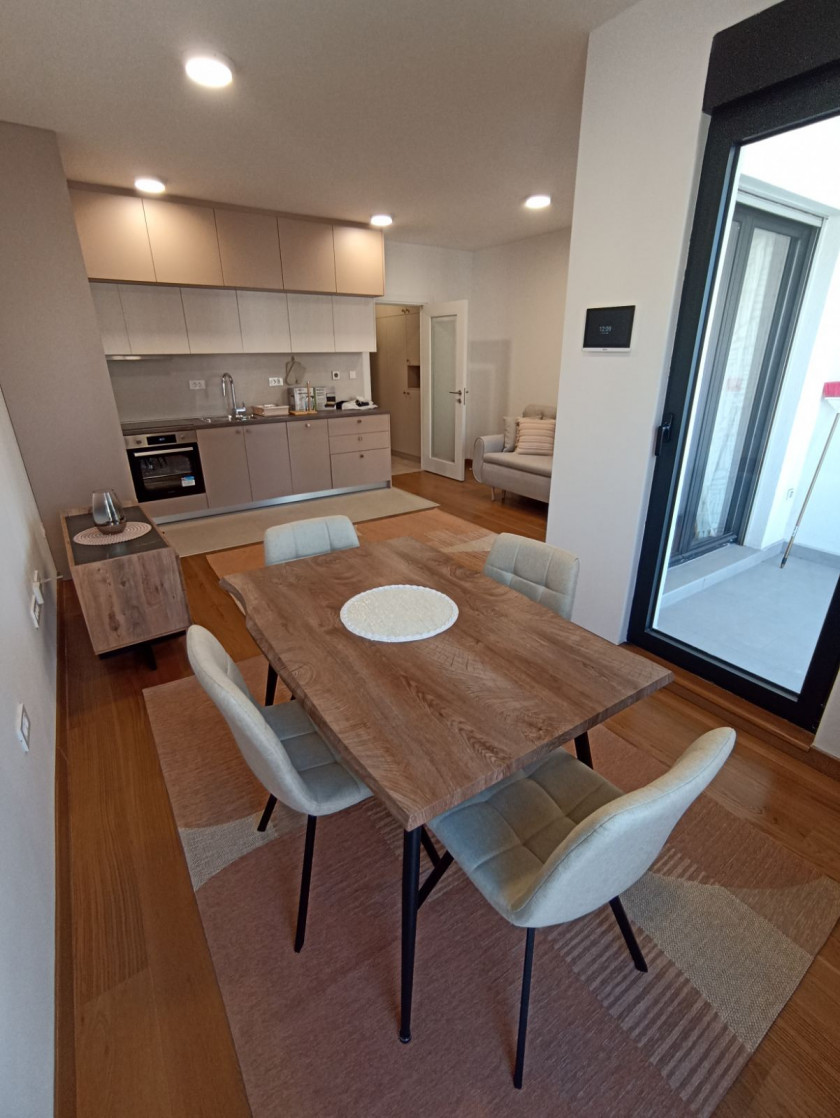 Struktura: širok, prostran ulazni hodnik, velika dnevna soba sa kompletno opremljenom kuhinjom i izdvojenim dijelom za trpezariju, veliko kupatilo, prostrana terasa sa lijepim pogledom.