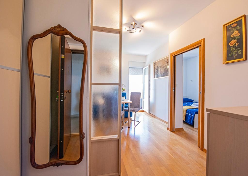 Stan se sastoji od spavaće sobe, kupaonice, dnevnog boravka sa kuhinjom i blagovaonica te prekrasnog balkona. Pripada mu i ostava u podrumu.