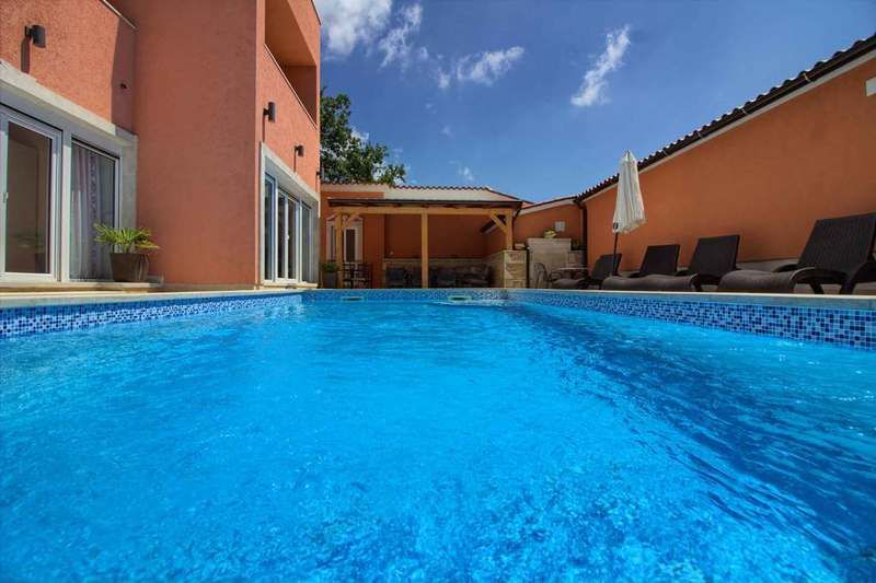 Opis (Engleski): Enjoy the simple luxury of this beautiful villa in Medulin, Istria, Croatia, just 300 meters from the sea. Once a quiet fishing village, Medulin has grown into a top tourist spot with its mild Mediterranean weather, clear sea, and winding coastline. Full of history, beaches, and fun activities, it's one of the Adriatic's best places to visit.The garden covers 505 square meters, and the house itself is 360 square meters—big enough for up to 14 guests. Step inside to six cozy bedrooms, each with its own private bathroom and shower. Seven air conditioners keep the whole place cool and comfy.The fully stocked kitchen has all the tools you need for family meals. Gather at the large dining table for 14 in the dining room, or head to the terrace for barbecues. From the living room, dining area, and kitchen, doors open to the lovely garden with a private 32-square-meter heated pool (using the Solgar system). Relax in the jacuzzi or play table tennis—it's all here for fun.Fully furnished and ready to go, this villa has worked great as a tourist rental for years, so the new owner steps into a solid business....