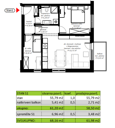 Stan S1 nalazi se u prizemlju zgrade i ima ukupnu površinu od 61,98 m². Sastoji se od ulaznog hodnika koji vodi u svijetao i prostran open space dnevni boravak s kuhinjom i blagovaonicom, iz kojeg se izlazi na ugodan balkon idealan za opuštanje i druženje. Uz dnevni dio, stan uključuje dvije spavaće sobe te moderno uređenu kupaonicu. Tlocrt stana osmišljen je tako da maksimalno iskoristi svaki kvadratni metar prostora, uz naglasak na udobnost i praktičnost.
