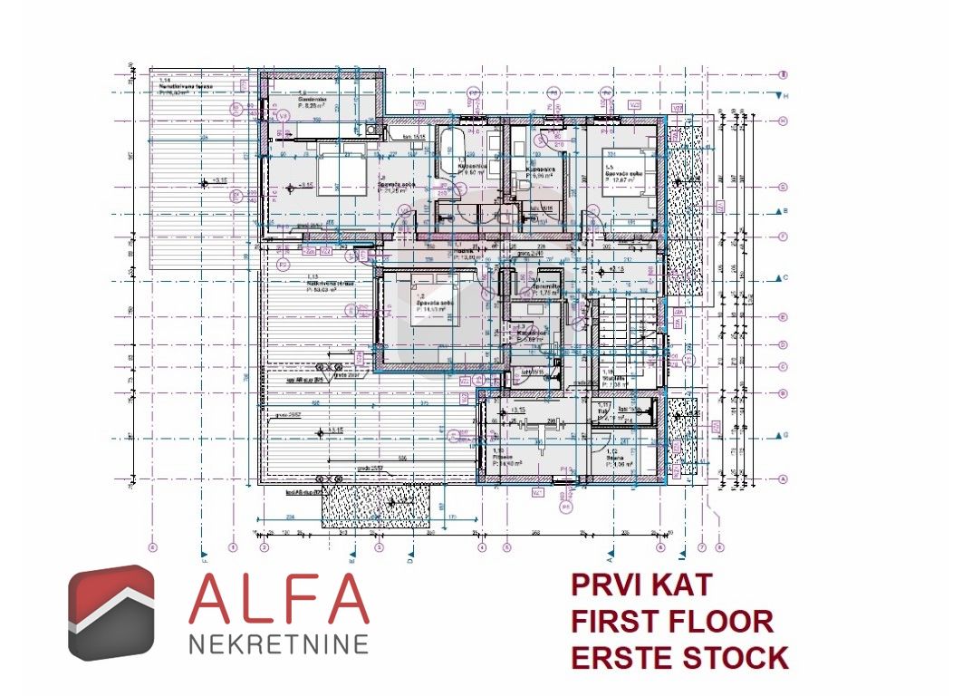 - Na prvom katu smještene su tri spavaće sobe, svaka s vlastitom kupaonicom, ostava, te zasebna prostorija predviđena za fitnes i saunu, sa tušem. Dvije spavaće sobe imaju izlaz na prostrane natkrivene i nenatkrivene terasa s kojih se pruža prekrasan pogled na grad i more.
