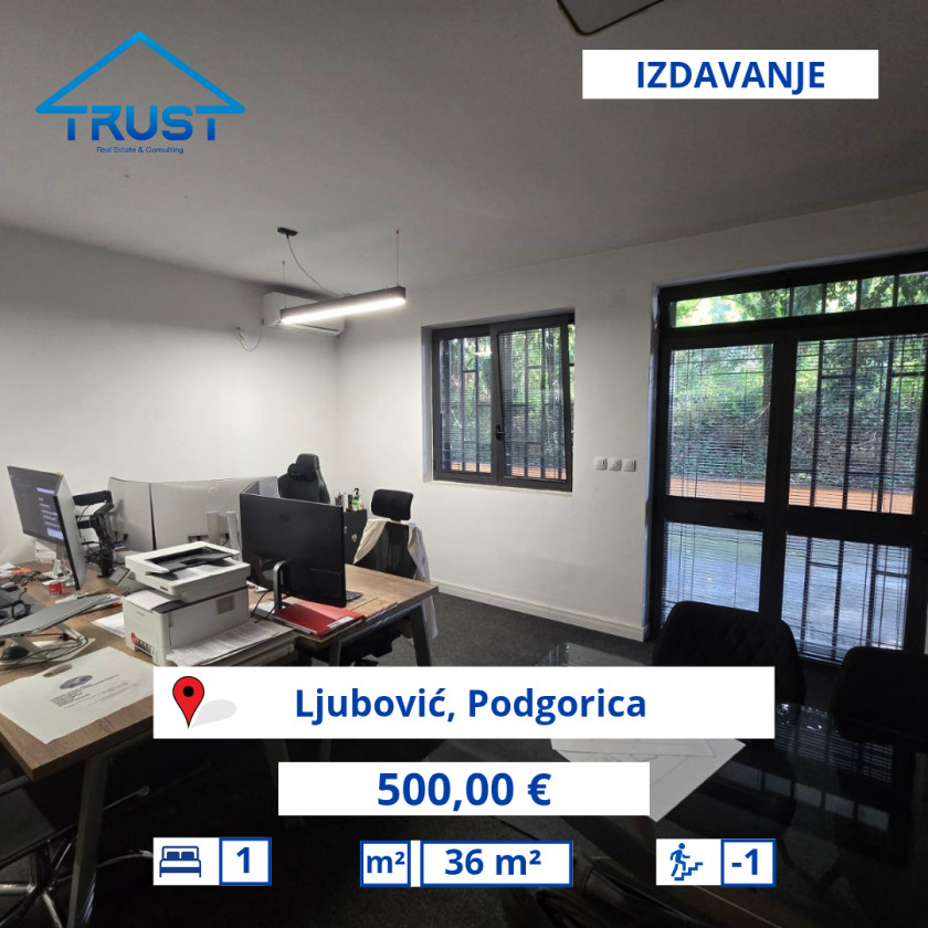 Vrsta: Poslovni Prostor za Duži Najam Područje: Podgorica Lokacija: Ljubović Cijena: €500 Spavaćih Soba: 1 Kupatila: 1 Stambena Površina: 36 m2 Klima Uređaj Čuvajte se prevara: NE vršite IBAN uplate