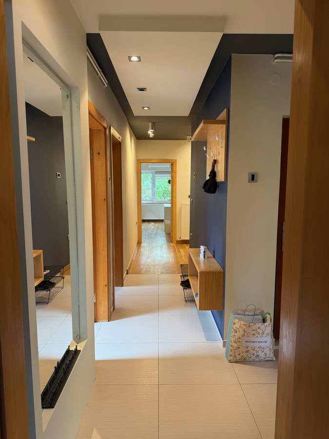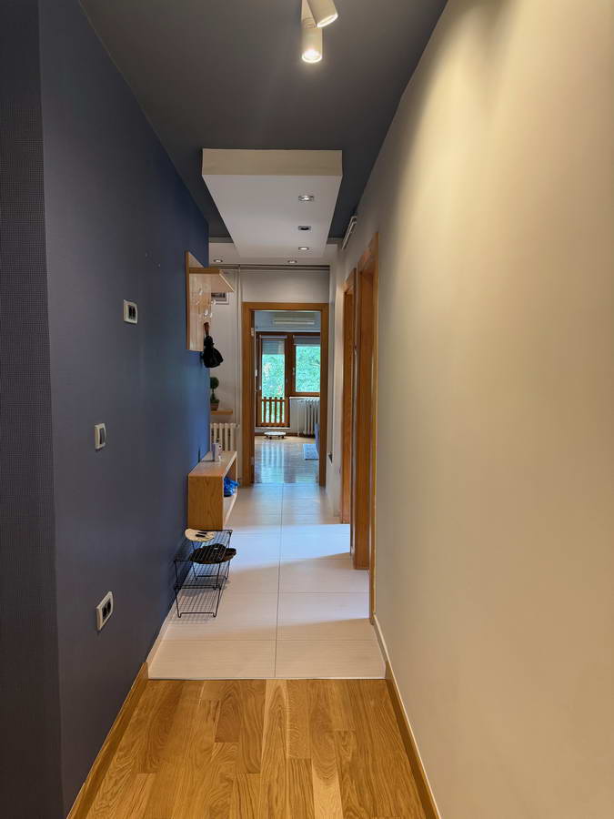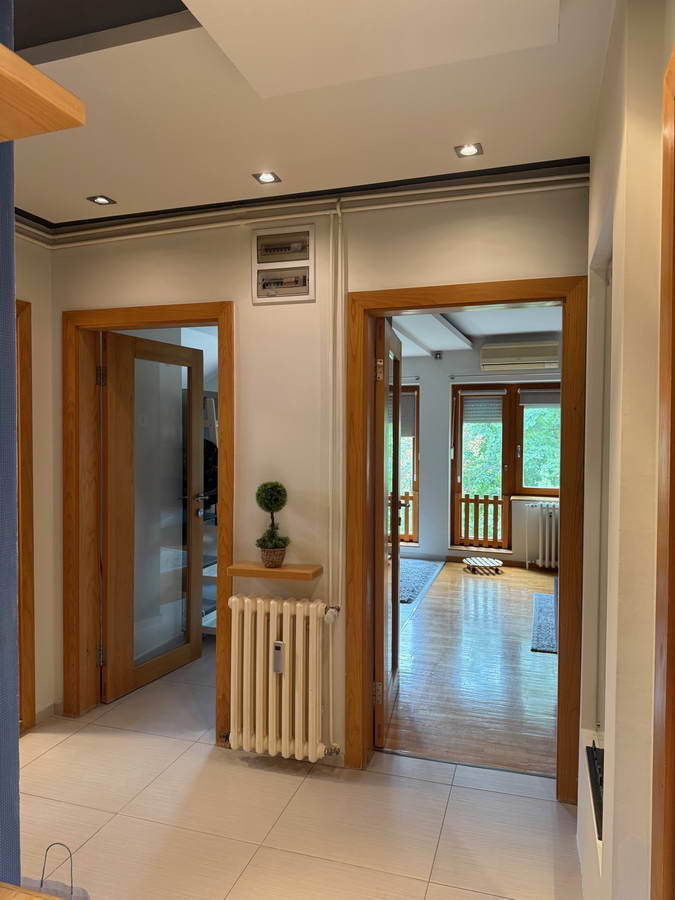 Opis: Mala Amerika - Četvoroiposoban stan u mirnom delu Male Amerike površine 100m2, okružen zelenilom i orijentisan na sve četiri strane sveta. Sve prostorije imaju prirodno provetravanje. Nalazi se na drugom spratu i zauzima celu etažu. To je ujedno i poslednji sprat. Sve instalacije u zgradi su nove. Stan ima dva kupatila, dnevnu zonu koja se sastoji od kuhinje, trpezarije i dnevne sobe, tri spavaće sobe i jednu radnu sobu. Uz stan idu tri pripadajuća podruma i postoji mogućnost kupovine garaže ispred zgrade. Stan je kompletno renoviran, prodaje se sa nameštajem koji je pravljen po meri od prirodnih materijala, kao i sva unutrašnja i spoljašnja stolarija koje su od drveta.