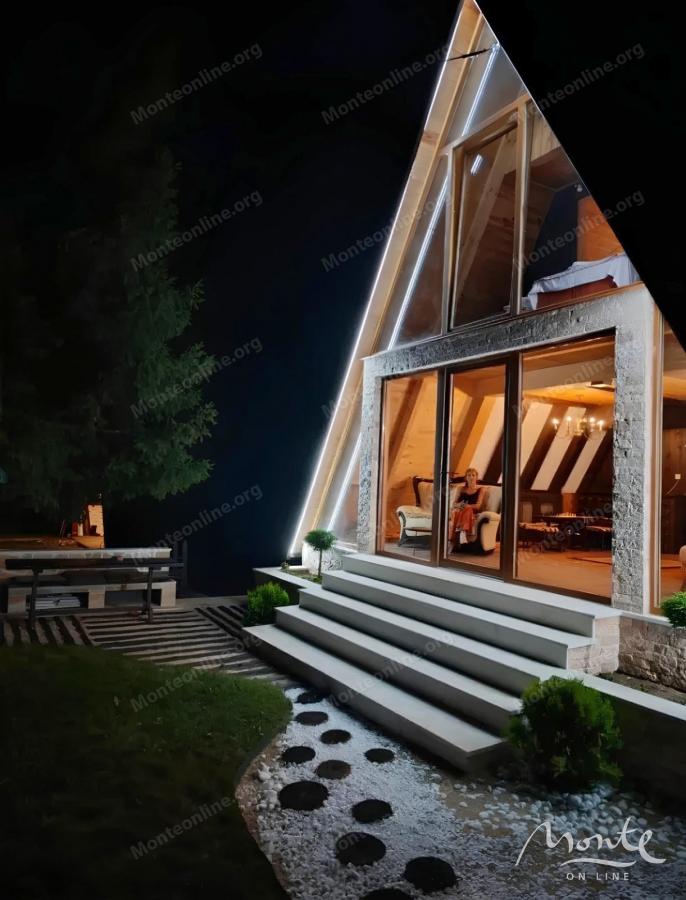 U prizemlju se nalazi dnevni boravak sa kaminom, kuhinja, kupatilo i velika terasa sa pogledom na planine i šumu.