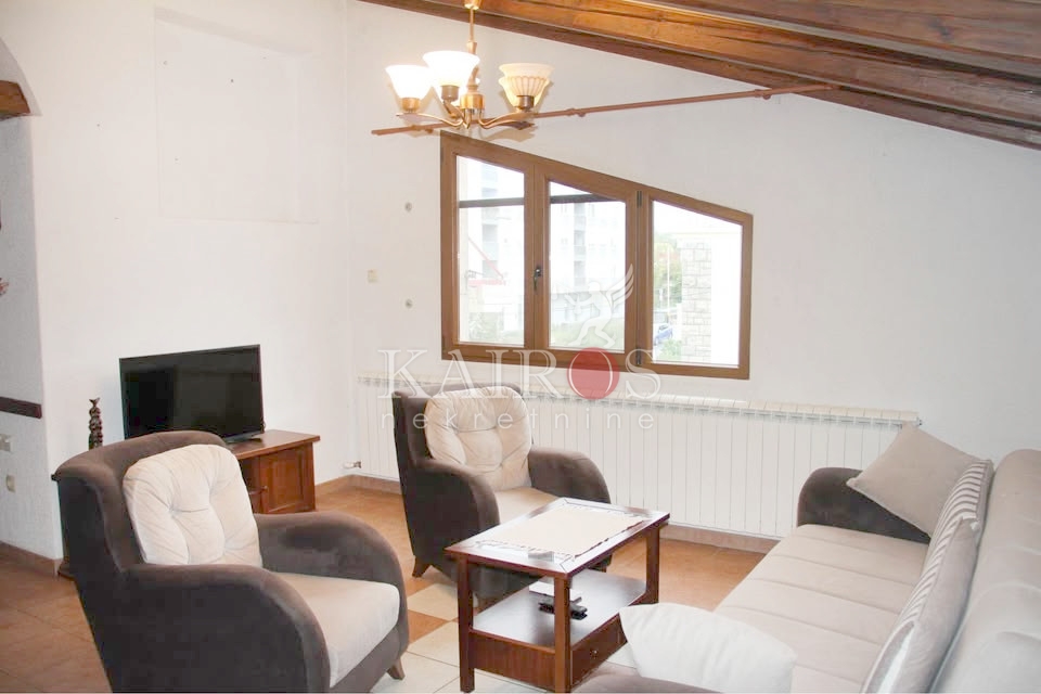Opis: DONJA VEŽICA, prodajemo etažu kuće, u naravi stan površine 125 m2, na 2. katu, visoko potkrovlje. Stan ima lođu na jugu s pogledom na more, dvije kupaonice, toalet. Ugrađena dva klima uređaja i centralno grijanje na struju.