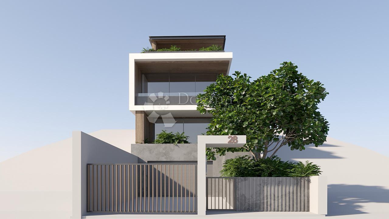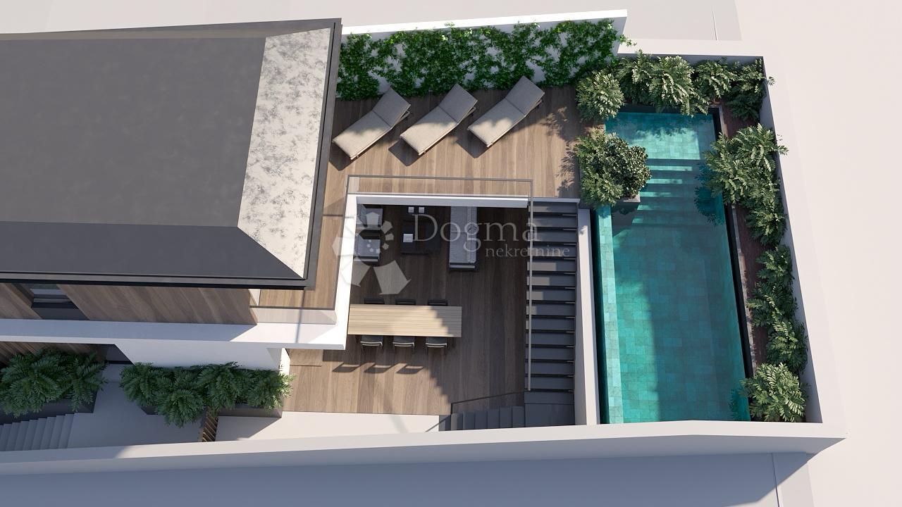 Prostrani četverosobni dvoetažni penthouse ukupne obračunske površine oko 218 m² (NKP) oduševljava promišljenim rasporedom, vrhunskom opremom i privatnim vrtom s bazenom.