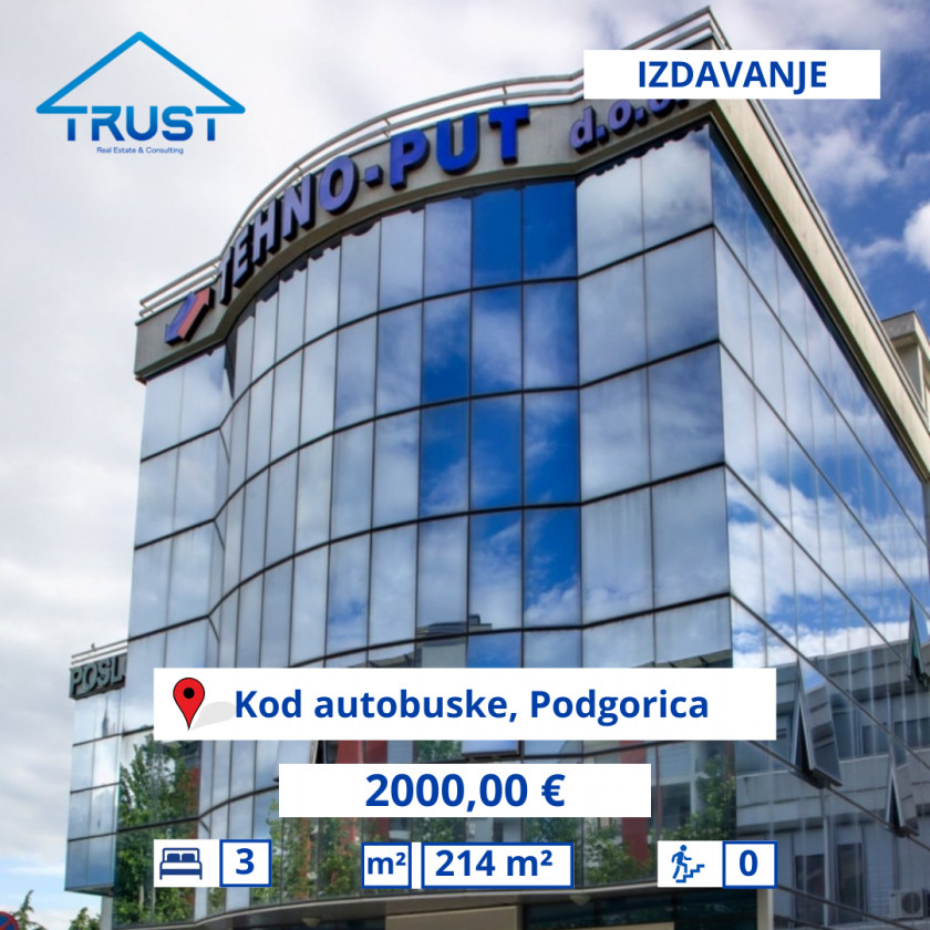 Vrsta: Poslovni Prostor za Duži Najam Područje: Podgorica Lokacija: Drpe Mandića Cijena: €2.000 Spavaćih Soba: 3 Kupatila: 3 Stambena Površina: 214 m2 Čuvajte se prevara: NE vršite IBAN uplate