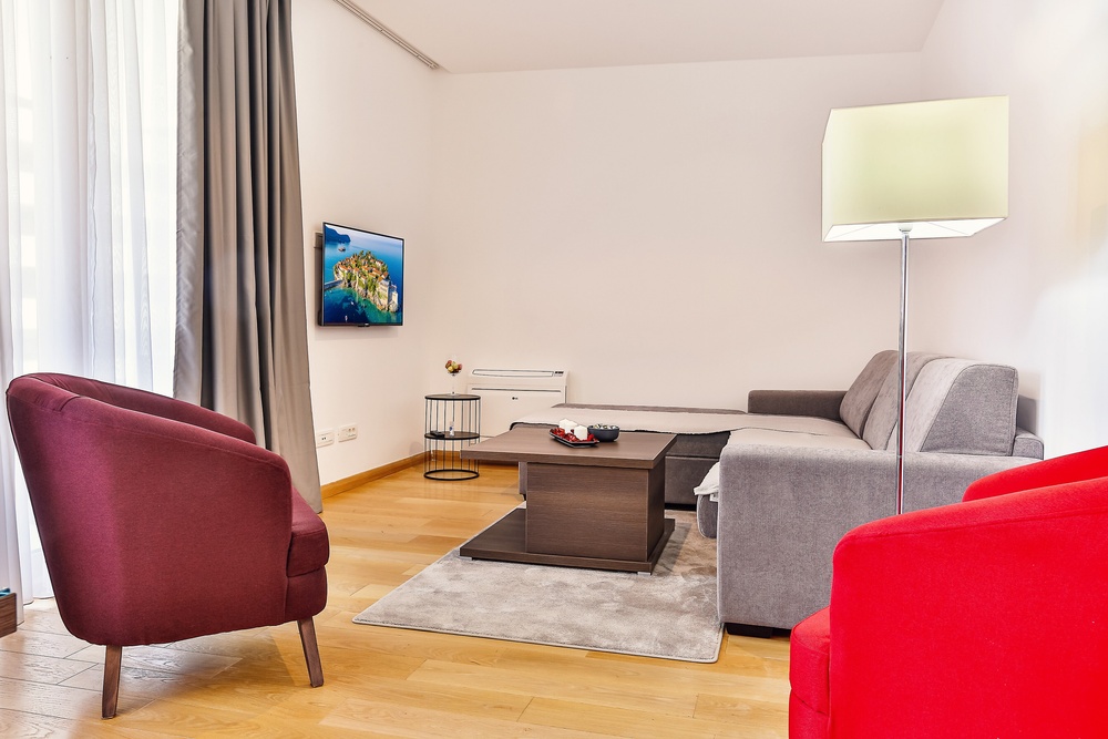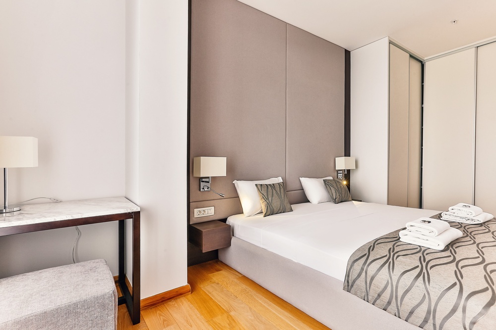 Izdaje se do 25 maja 2026 godine, dvosoban stan u samom centru Budve, na prvoj liniji mora. Stan ima površinu od 76 m² i nalazi se u novom hotelskom kompleksu, na osmom spratu.