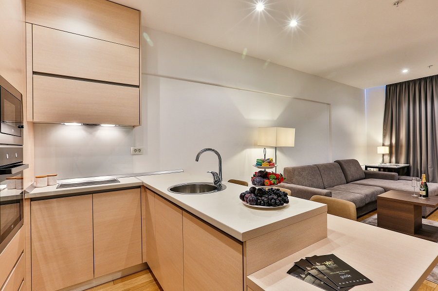 • Кухня: посудомоечная машина, стеклокерамическая электрическая плита, встроенная духовка, вытяжка, холодильник, электрический чайник, посуда, встроенная микроволновая печь
