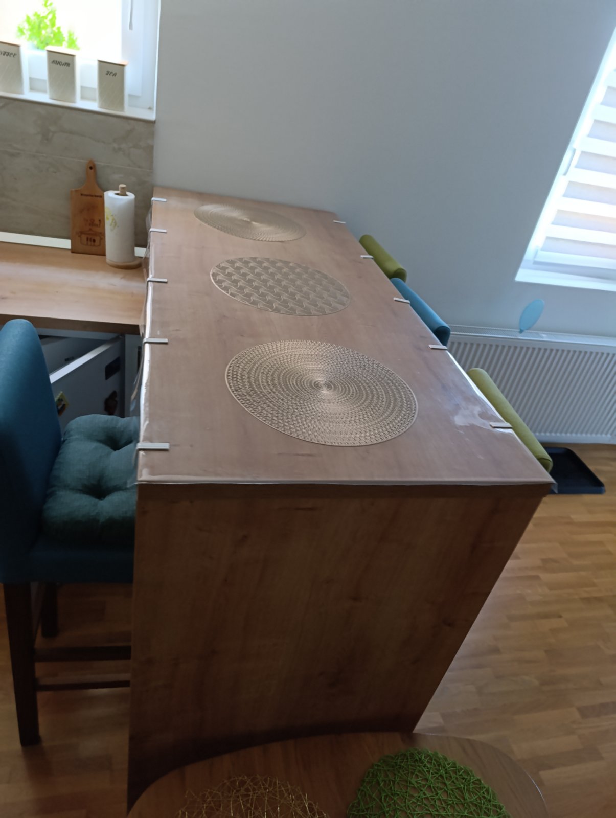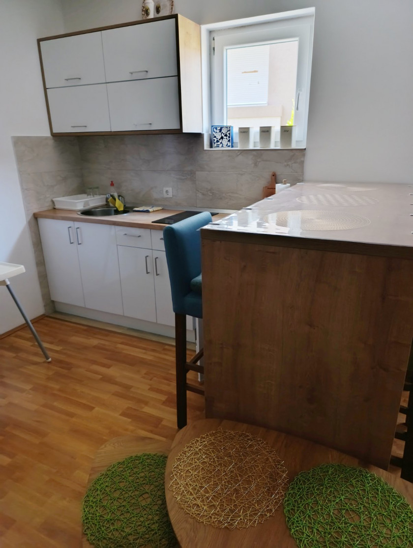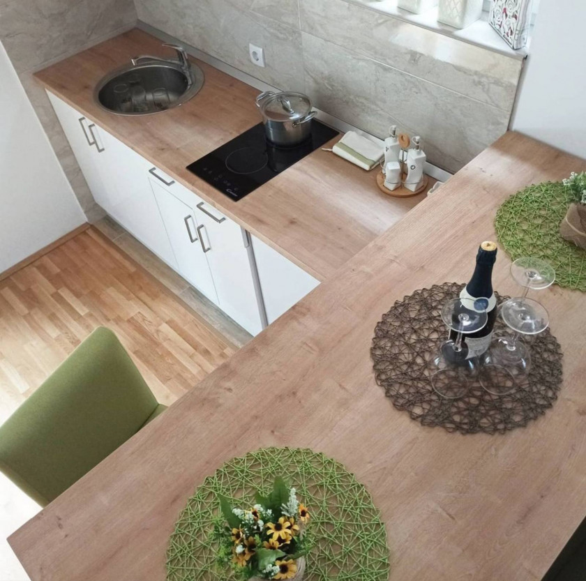 Raspored je funkcionalan – dnevna soba sa kuhinjom i trpezarijom, odvojena spavaća soba, kupatilo i terasa.