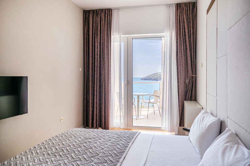 Opis: Однокомнатная квартира в самом центре Будвы с террасой и видом на море, на первой линии, 12 этаж, большая круглая башня, площадь 77 м².