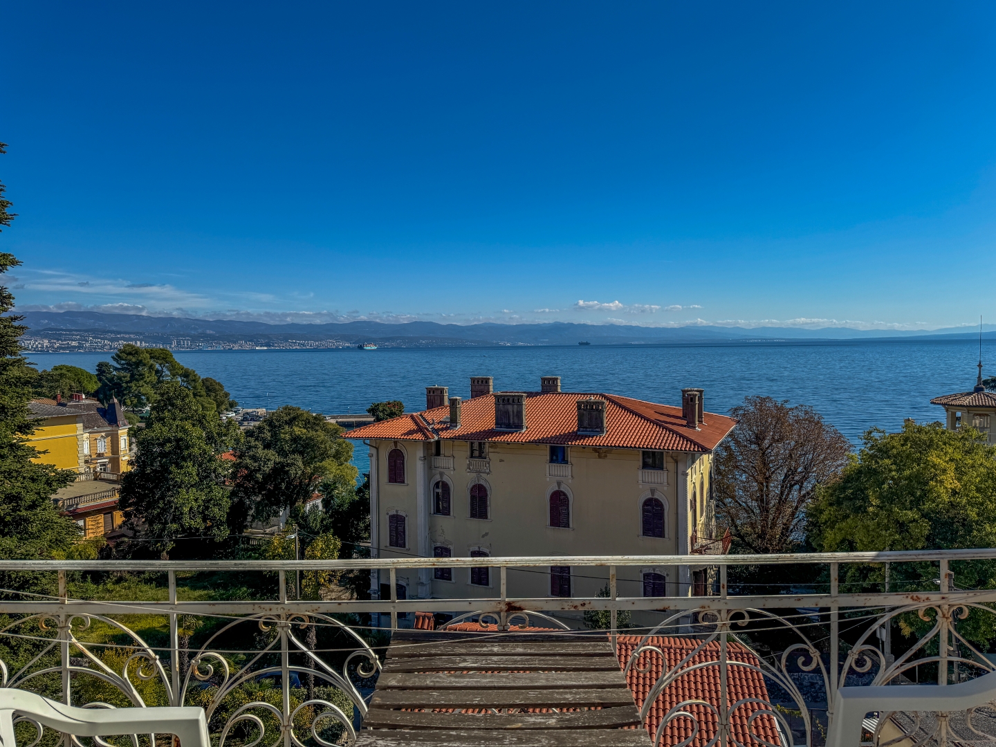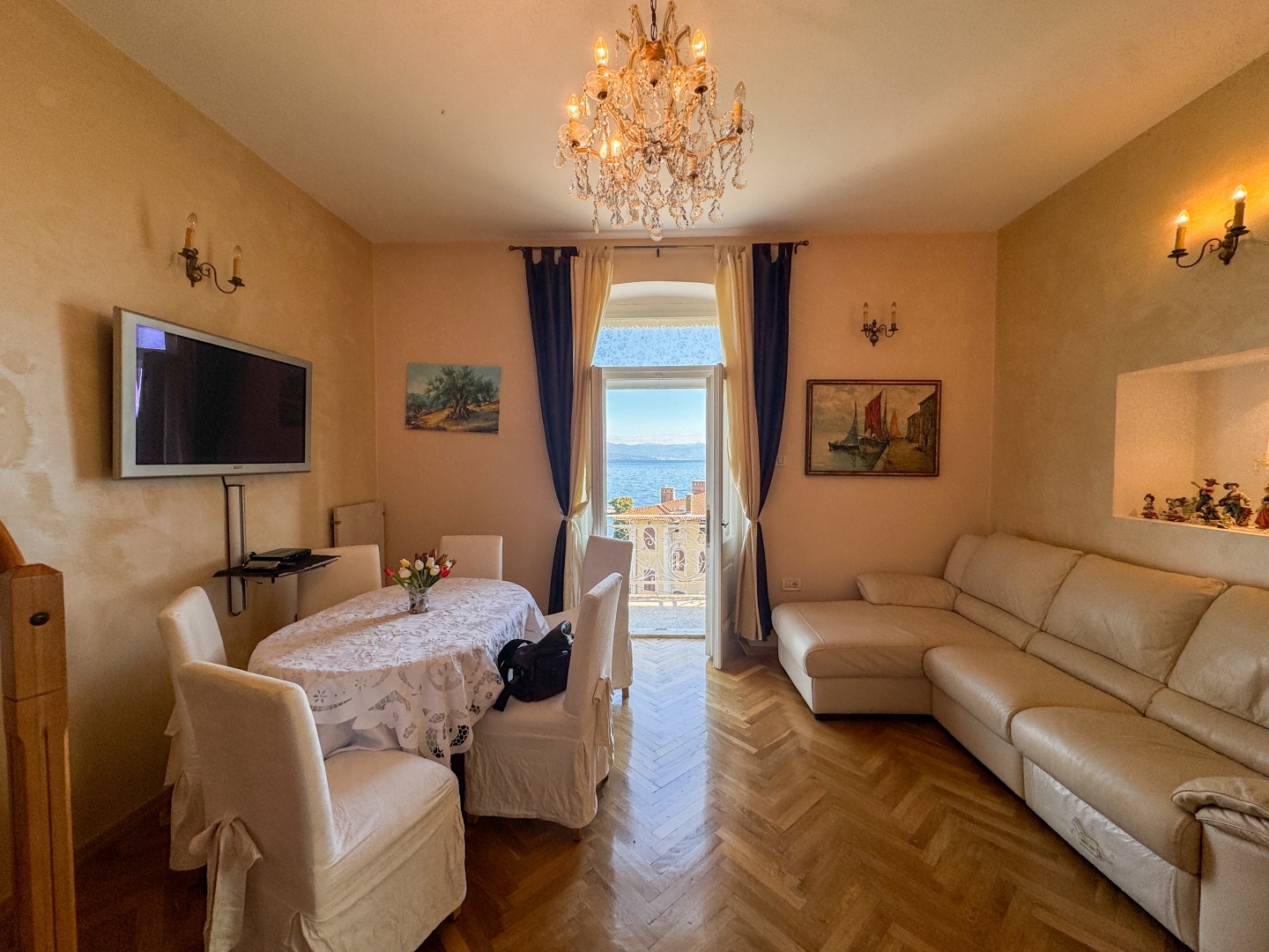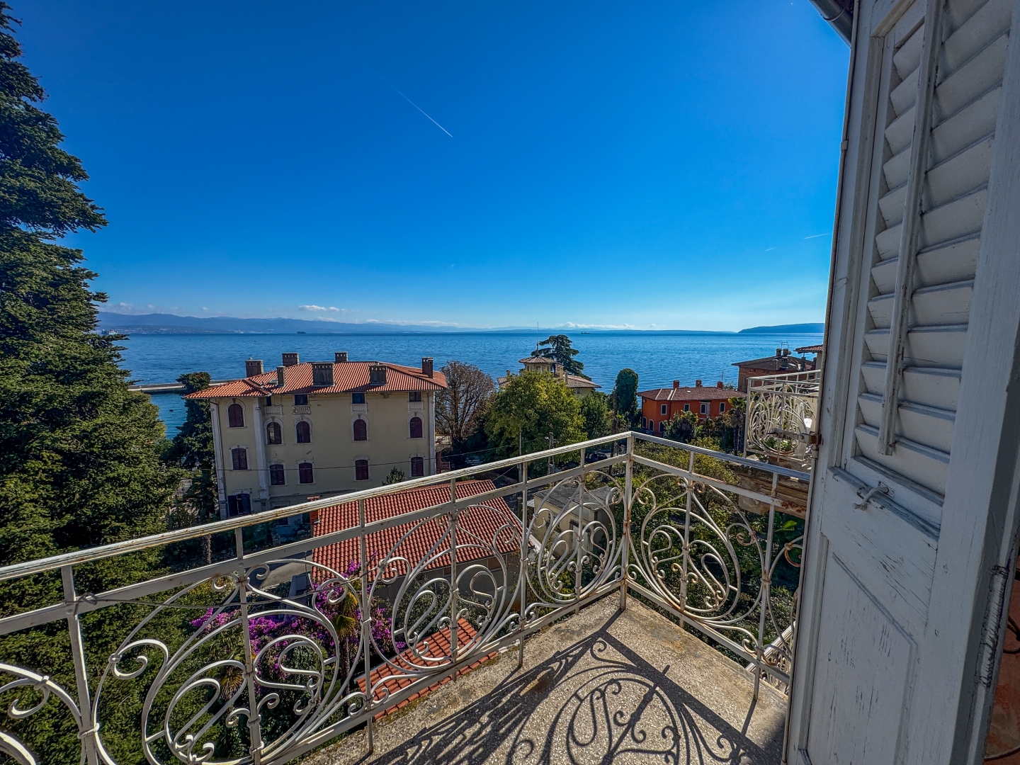 Opis (Engleski): Lovran – a beautiful opportunity to buy a historic apartment in a seaside villa, second row from the sea, with terrace and sea viewThis charming apartment of 90 sq.m. is located just a few steps from the sea, 100m from Lungomare, in one of the most desirable streets in Lovran, near Opatija. It sits on the third floor of an Austro-Hungarian villa and offers a perfect combination of history, character, and comfort.The apartment consists of an entrance hall, a kitchen, a large bathroom with a window, a spacious south-facing bedroom with its own balcony and sea view, and an open-plan living room with access to another balcony overlooking the Adriatic. A spiral staircase leads to the attic level, where there is a second bedroom with a private bathroom.The property is in good and functional condition....
