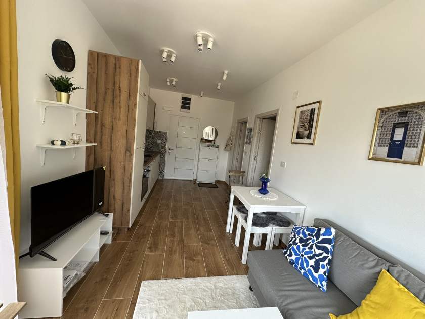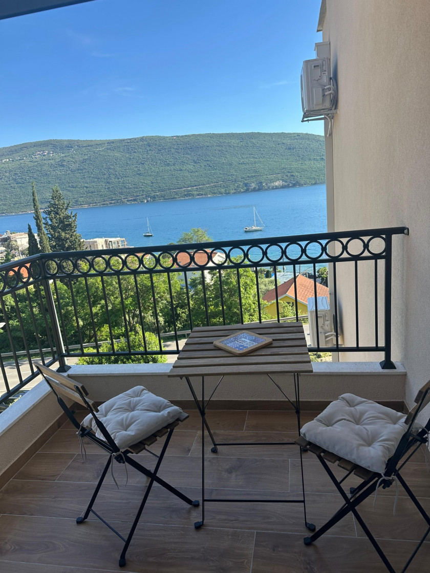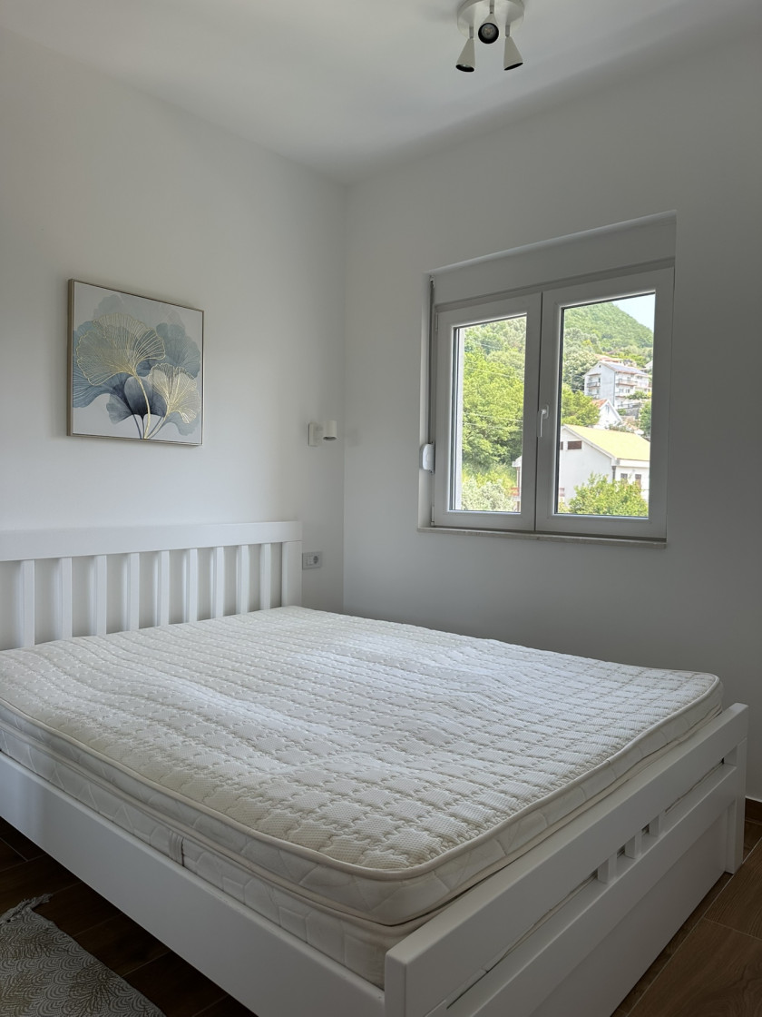 Opis: Iznajmljujem nov stan u Kumboru.Kompletno namjesten. Ima jednu spavacu sobu,kuhinju i troezariju,kupatilo, terasu prema moru.Parking mjesto, lift.