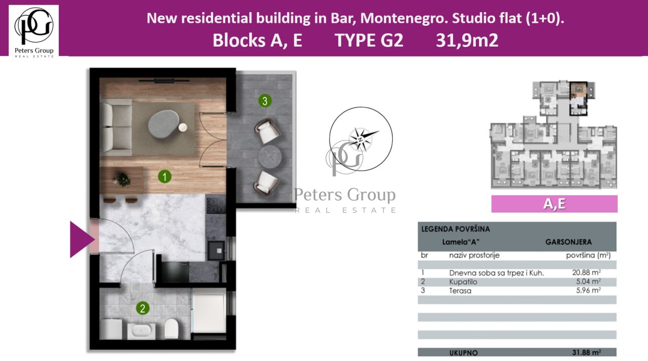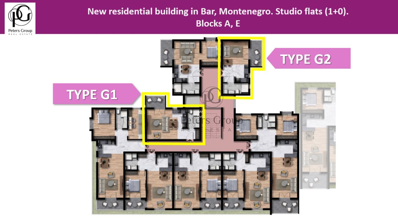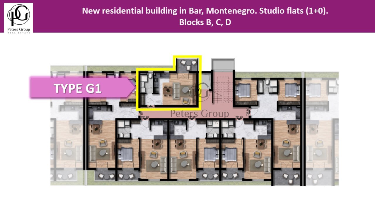 Na prodaju su dva tipa studija (1+0) – Tip G1 i Tip G2, dostupni od prizemlja do 3. sprata.