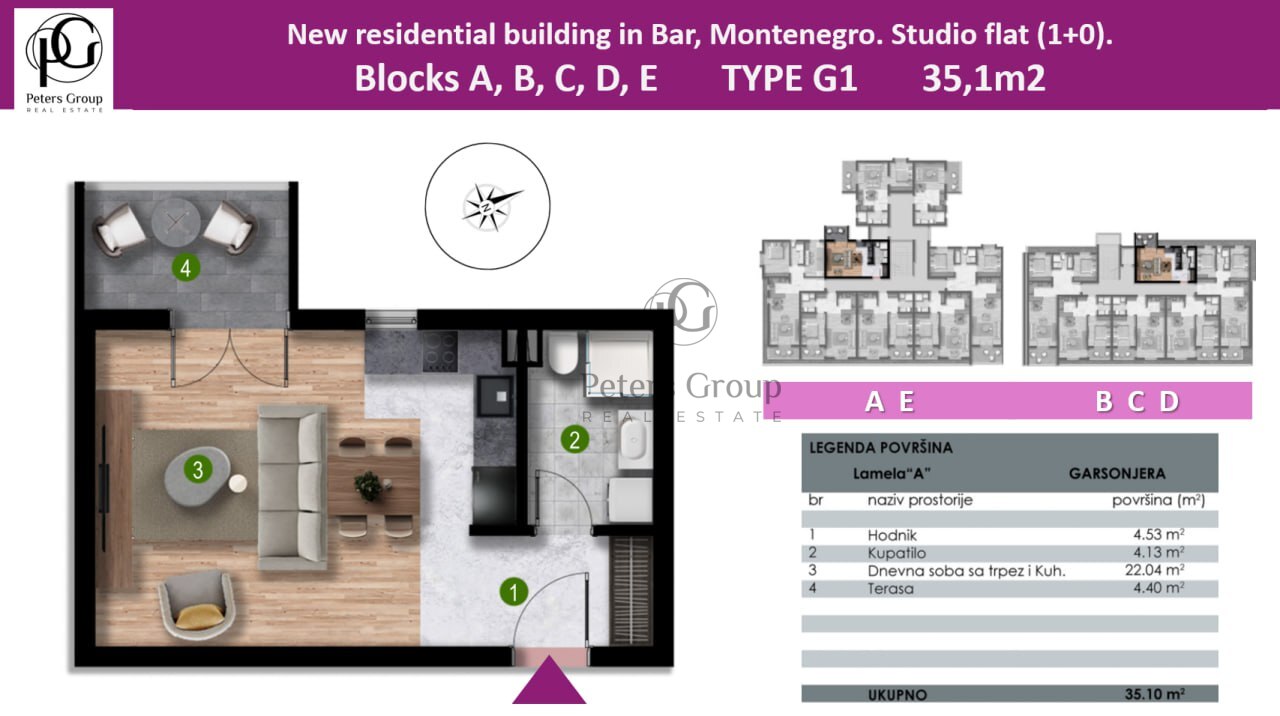 · Tip G1. Površina 35.1 m². Prostran studio: hodnik, dnevna soba i kuhinja sa trpezarijom ukupne površine 27m², kupatilo, terasa. Prozori su okrenuti ka zapadu, prema moru. Prekrasan pogled na planine. Sa najvišeg sprata vidi se more.
