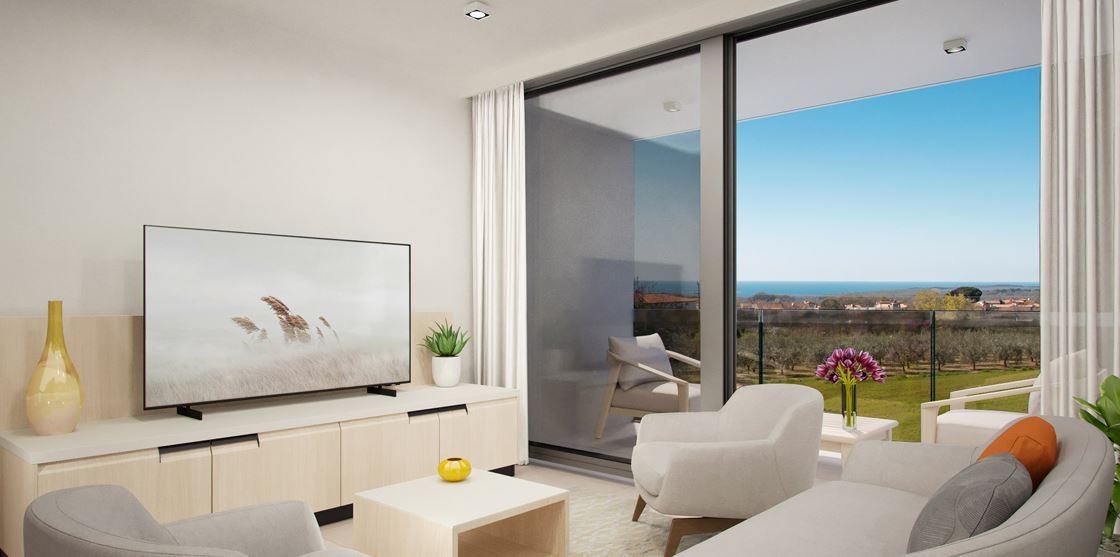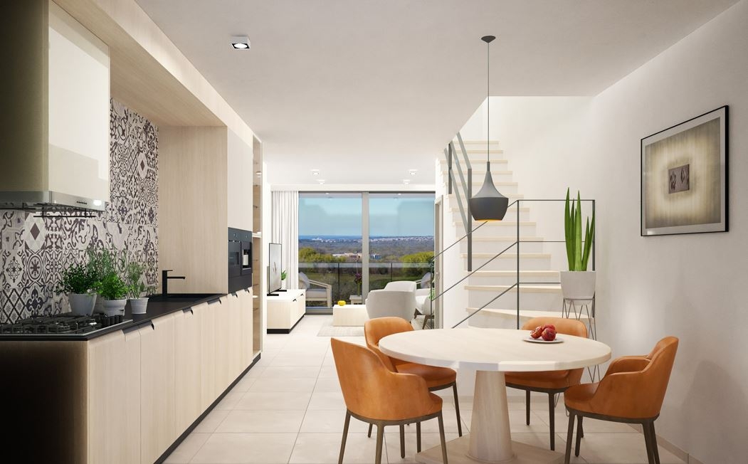 Opis (Engleski): Just outside Poreč, in the charming village of Nova Vas only 5 km from the sea, a modern two-level apartment in a newly built residence is for sale. The property is set in a peaceful and pleasant environment that perfectly balances privacy with proximity to all essential amenities. Covering 76.57 m², the apartment has been carefully designed to provide maximum comfort, functionality, and contemporary style.The lower level features an entrance hall, a bright living room, a kitchen with dining area, a loggia ideal for relaxation, and a guest toilet conveniently located beneath the staircase. An elegant internal staircase leads to the upper floor, where two spacious bedrooms and a modern bathroom offer a comfortable and private living space.The apartment is equipped with electric underfloor heating in the bathroom, and all rooms have air conditioning units providing heating and cooling throughout the year. A video intercom system enhances both comfort and security....