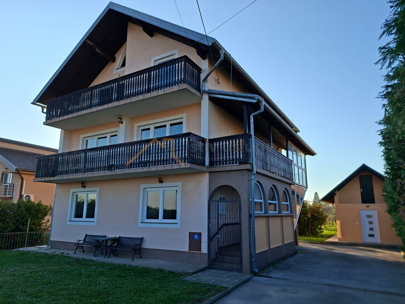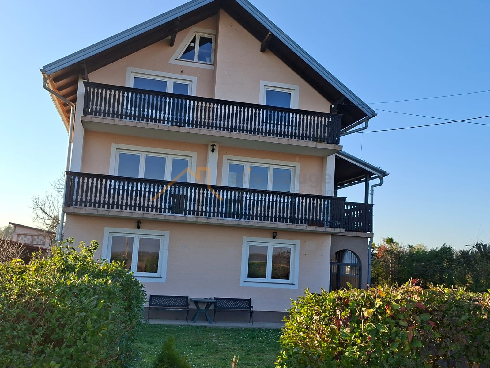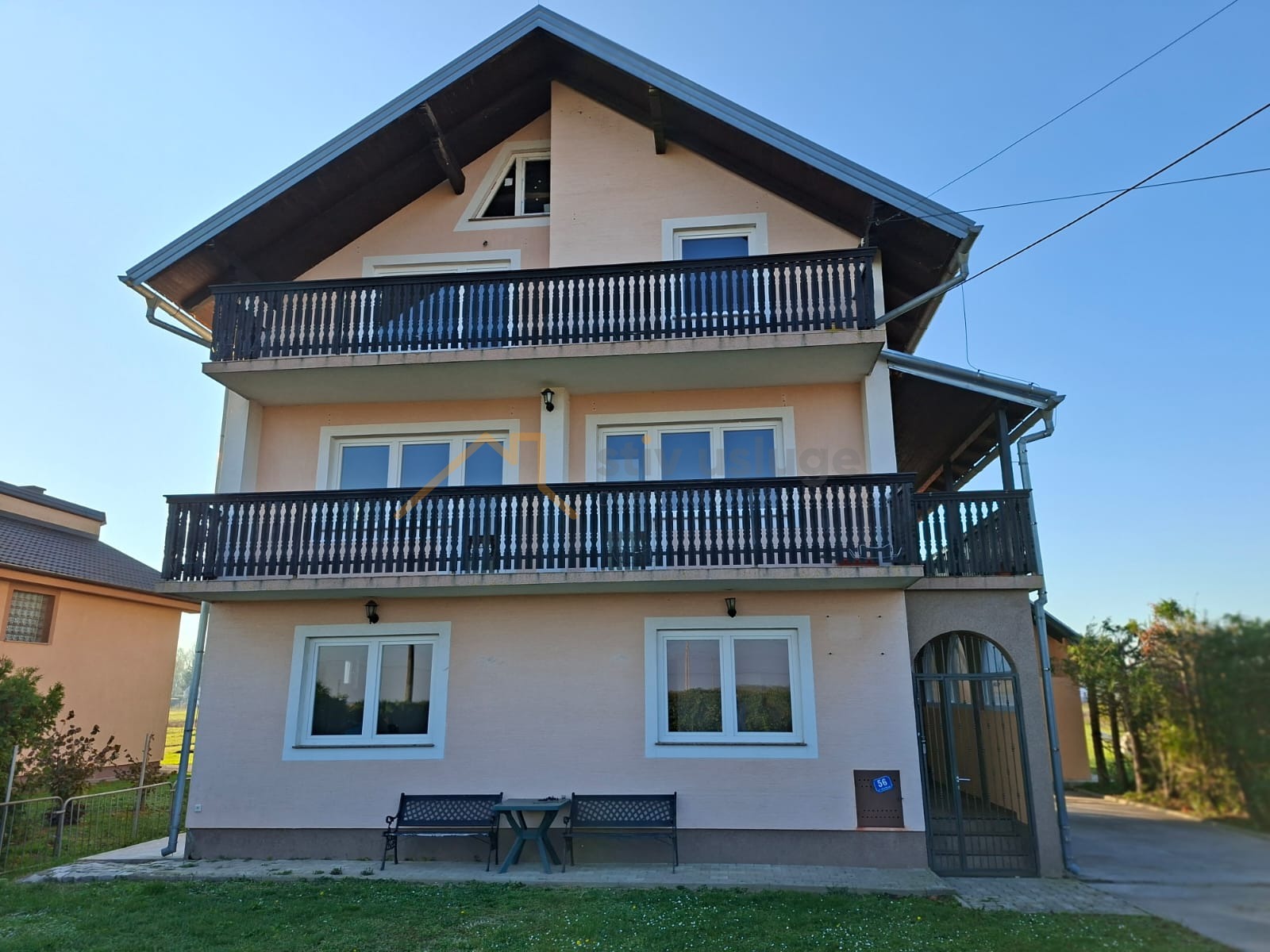 Kuća se sastoji od prizemlja, 1 kata i visokog potkrovlja. Prizemlje se sastoji od 3 sobe, hodnika, open space dnevnog boravka/kuhinje/blagovaonice. i kupaonice. Na kat i potkrovlje se ulazi vanjski stepenicama, te čite jedno stambenu cjelinu. Kat se sastoji od 3 sobe, hodnika i kupaonice. Potkrovlje se sastoji od 3 sobe, hodnika, čajne kuhinje i kupaonice.Kuća je spojena na sljedeću komunalnu infrastrukturu:- gradska kanalizacija,- gradski vodovod,- gradski plinovod,