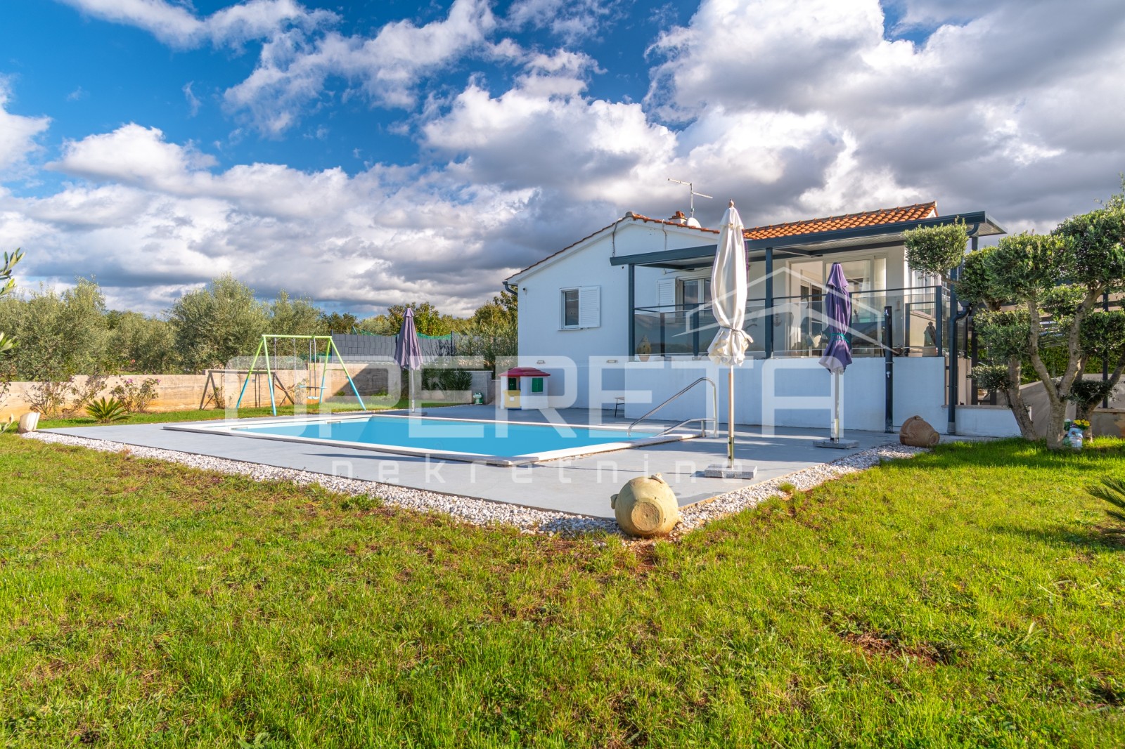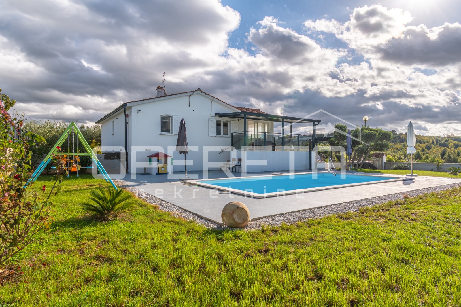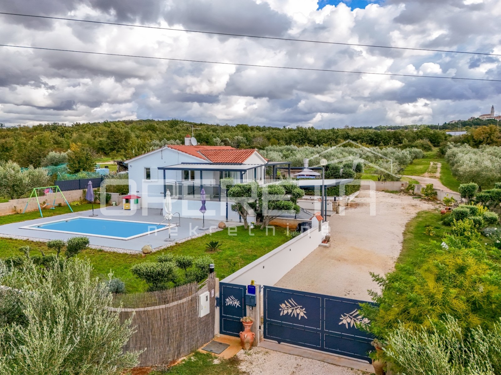 Opis: Na prodaju je šarmantna, samostojeća i legalizirana kuća smještena u mirnom mjestu, udaljenom samo 8 km od Poreča. Ova oaza mira nalazi se u prirodi, okružena prostranim poljoprivrednim zemljištem veličine 3000 m2, sa zasađenim maslinama. Kuća ukupne površine 120 m2 sastoji se od visokog prizemlja i podruma. Visoko prizemlje nudi potpuno namješten i opremljen dvosobni stan, adaptiran 2021. godine, koji se sastoji od dnevnog boravka, kuhinje s blagovaonicom i dvije kupaonice. U prostranom podrumu, površine 40 m2, postoji mogućnost uređenja dodatnog stana s obzirom na to da su sve potrebne instalacije već pripremljene. Eksterijer i dodatni sadržaji: Dvorište je pažljivo uređeno i ograđeno, te nudi brojne sadržaje za opuštanje: Bazen veličine 32 m2, dvije velike terase s lounge zonom, ljetna kuhinja s roštiljem, vanjsko kupatilo i jacuzzi, te tri natkrivena parkirna mjesta.