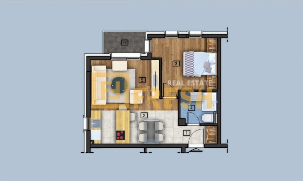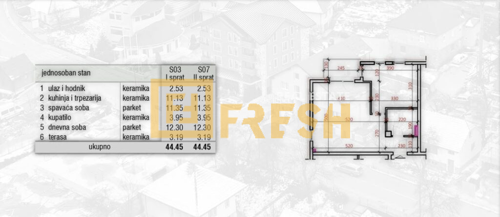 Opis: Jednosoban stan, površine 44.5m2, Kolašin na 1. i 2. spratu stambene zgrade u izgradnji koja posjeduje lift i garažu.