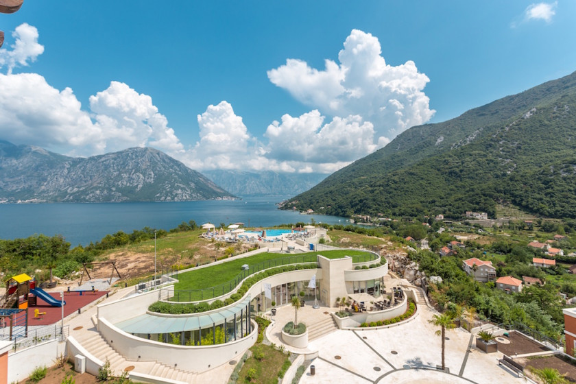 U kompleksu se nalaze dva bazena – veliki bazen sa prelivom i dječji bazen. U okruženju pejzažnih vrtova smještena je dječja igraonica i dvorište ozelenjeno mediteranskim biljkama sa fontanom.
