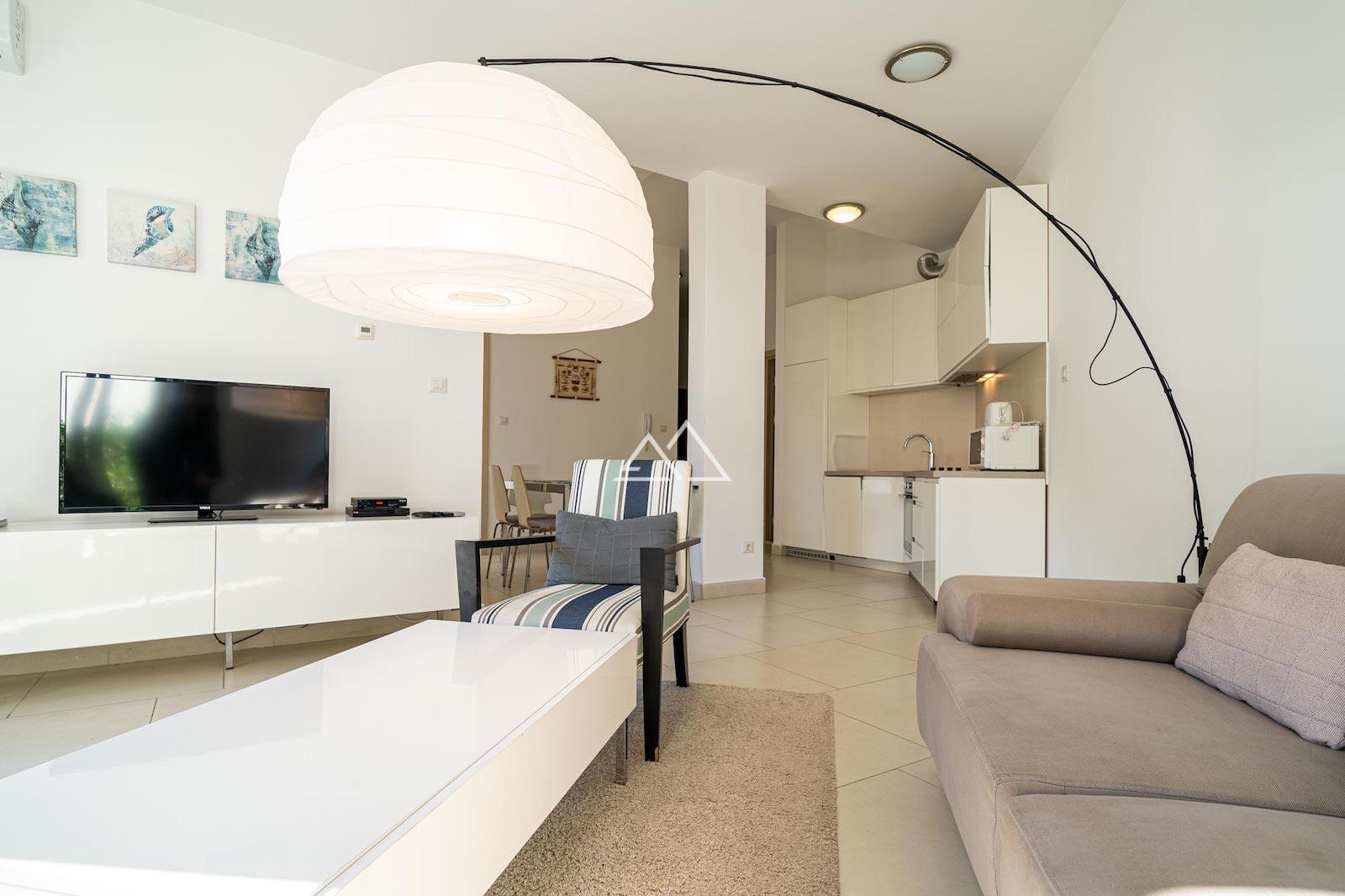 Stan se sastoji od dnevne sobe sa kuhinjom i trpezarijom, dvije spavaće sobe, dva kupatila i terase koja izlazi u malo zeleno dvorište.