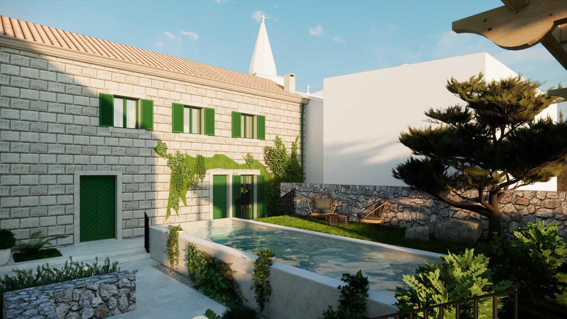 The price includes a finished project for a two-story stone villa with a swimming pool, a spacious living room, a dining room, a kitchen, a guest toilet, three bedrooms, two bathrooms, and two storage rooms.