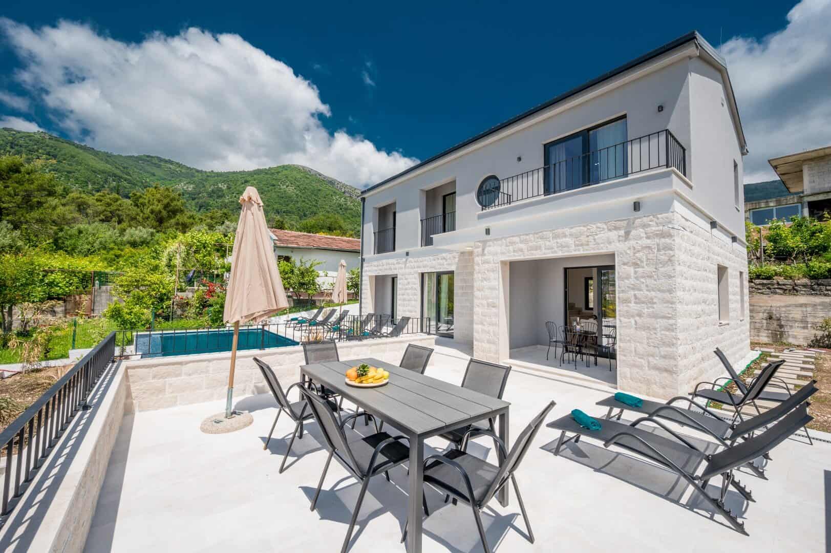 Tivat, Mrcevac, a newly built villa with modern design, featuring a swimming pool, garage, and parking space, with panoramic sea views.