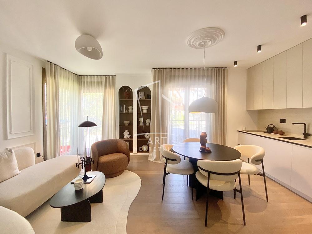 Opremljen je u minimalističkom, skandinavskom stilu sa nameštajem brendova Calligaris, Furninova, Kartell, 101copenhagen, Stoff Nagel, Fermliving, Franke, Laufen i Bosch.