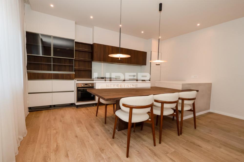 Ceo stan greju i hlade toplotne pumpe sa podnim grejanjem. Pod je tarket prve klase, keramika euro dom, nameštaj i kuhinja ,,calligaris" Ovih 116 m2 čini ulaz sa walk in garderoberom, prostranim i svetlim dnevnim poravkom koji izlazi na terasu, trpezarija, kuhinja, jedna izuzetno prostrana spavaća soba, druga spavaća soba je nameštena takodje calligaris nameštajem i ima sopstveni walk in garderober kao odvojenu prostoriju i manju zastakljenu terasu. Kupatilo ima prirodnu svetlost i ventilaciju sa vodootpornim zidovima. Takodje postoji i manja ostava za veš mašinu...