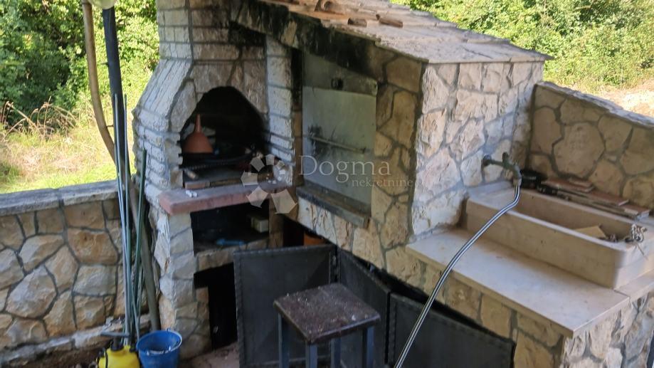 Okućnica je okružena zelenilom, a na njoj se nalazi roštilj.