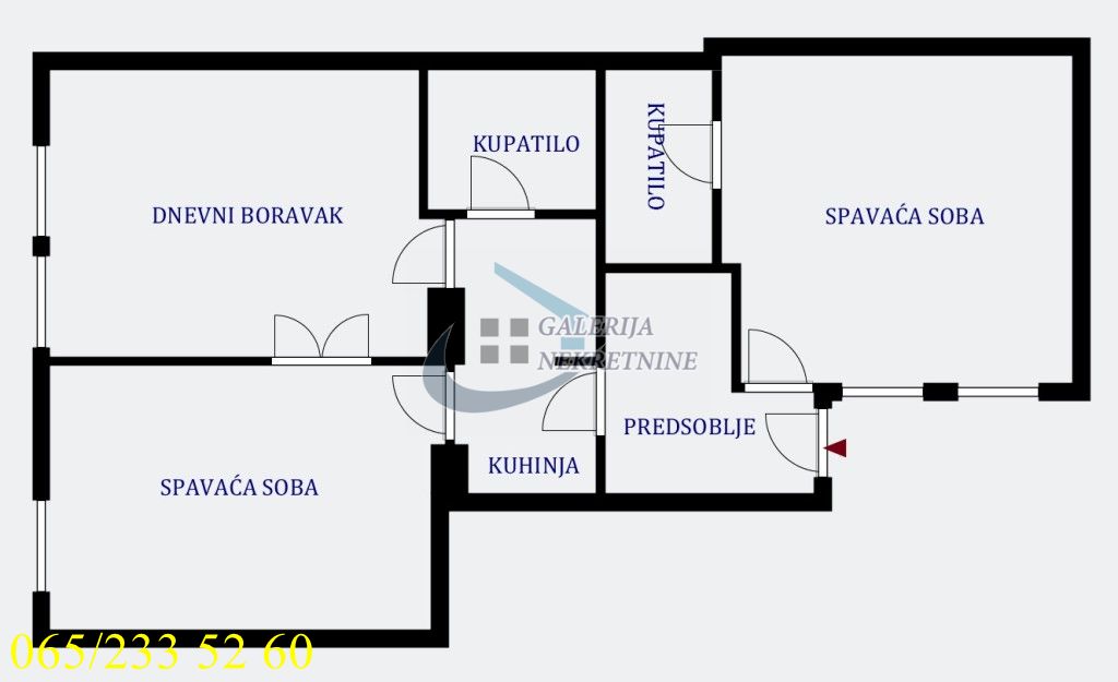 Od prostorija: predsoblje, hodnik u kome se nalazi blok kuhinja, dnevni boravak, dve spavaće sobe, dva kupatila, terasa preko koje se ulazi u stan.