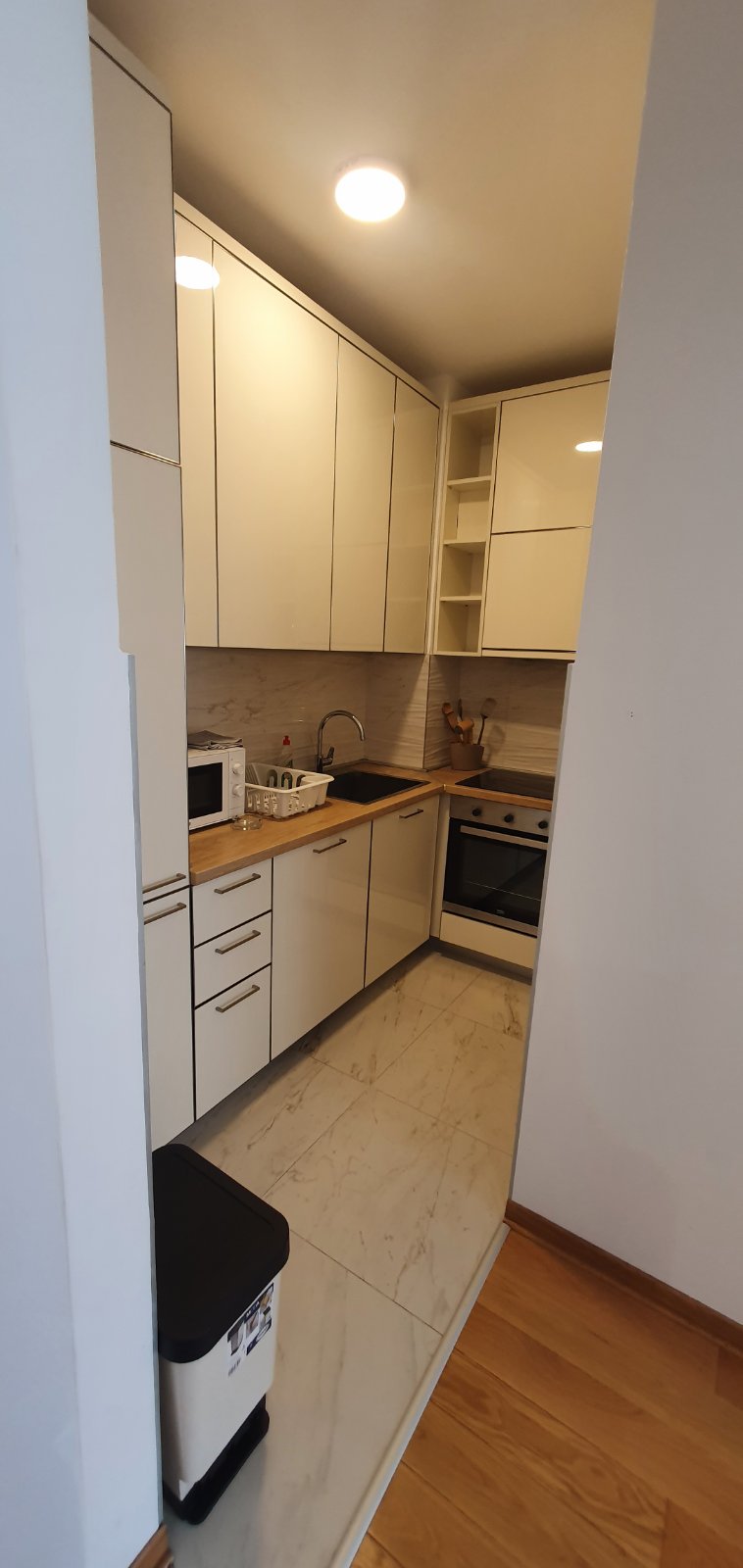 Struktura stana: dnevna soba sa kuhinjom i trpezarijskim stolom, spavaća soba, kupatilo i terasa.