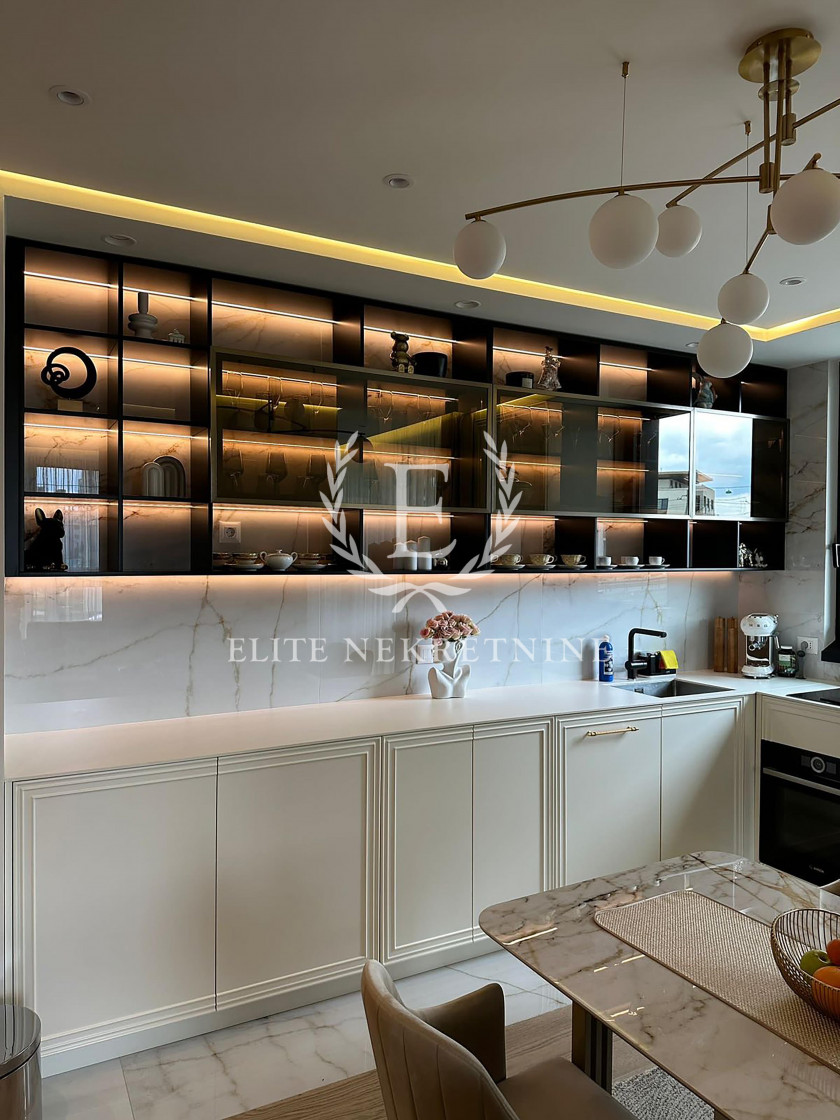 Stan je pažljivo uređen do najsitnijih detalja, sa odabranim komadima nameštaja, kvalitetnim materijalima i savremenom opremom. Sastoji se od dnevnog boravka sa trpezarijskim delom, moderno opremljene kuhinje, dve udobne spavaće sobe, dva elegantna kupatila i terase koja pruža prijatan prostor za odmor.