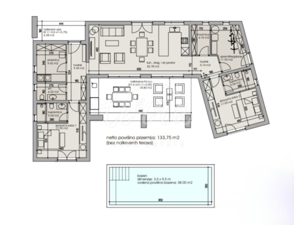 +38m2 natkrivene terase+8m2 natkrivenog ulaza na zemljištu površine 1.100m2.