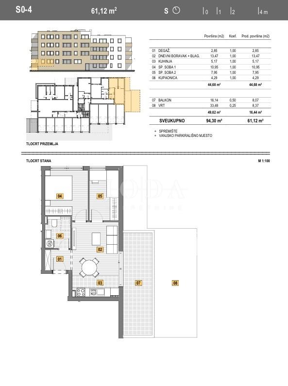 će sadržavati 31 ostavu, u prizemlju će biti smješteno 10 garaža, a pored zgrade biti će 21 vanjsko parkirno